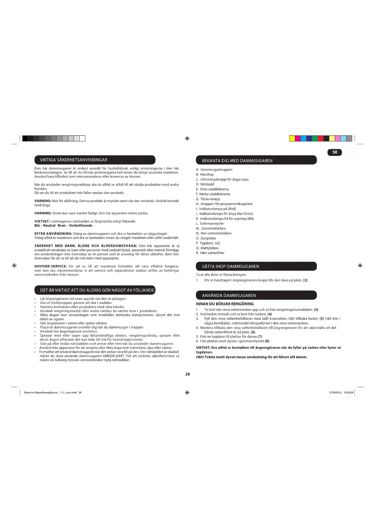 - Dynan för rengöring kan redan vara fullt med smuts och måste tvättas. Se avsnittet för underhåll. VIKTIG INFORMATION Reserv- och förbrukningsdelar från Hoover Använd alltid originaldelar från Hoover vid byte. Du kan beställa delar från närmaste Hoover- återförsäljare eller direkt från Hoover. Uppge alltid modellnummer när du beställer delar. Förbrukningsdelar Textil dyna: 35601334 Filter: 35601335 Hoover-service Kontakta ditt närmaste Hoover-servicekontor om du behöver service. kvalitet Hoovers fabriker har kvalitetsbedömts av oberoende organisationer. Våra produkter tillverkas enligt ett kvalitetssystem som uppfyller kraven för ISO 9001. Miljön: Den här apparaten är märkt enligt det europeiska direktivet 2002/96/EG om avfall som utgörs av eller innehåller elektriska eller elektroniska produkter (WEEE). Genom att se till att produkten avfallshanteras på rätt sätt kan du hjälpa till att hindra möjliga negativa konsekvenser för miljö och hälsa. Symbolen på produkten visar att den inte får hanteras som hushållsavfall. Den ska i stället lämnas in på en insamlingsplats för återvinning av elektrisk och elektronisk utrustning. Avfallshanteringen ska utföras enligt de lokala miljöbestämmelserna. Mer utförlig information om hantering och återvinning av produkten kan du få från kommunen, återvinningsanläggningen eller den butik där du köpte produkten. Garanti Garantivillkoren för produkten denieras av vår representant i det land där produkten säljs. Du kan få uppgifter om aktuella villkor från återförsäljaren. Kvittot måste visas upp när man kräver ersättning enligt garantin. Uppgifterna kan ändras utan föregående meddelande. FRÅGOR OCH SVAR OM RENGÖRING När är steamjet redo att användas? Inom 30 sekunder. Kan jag använda steamjet på vilka golv som helst? På alla hårda golv. Dvs marmor, keramik, sten,linoleum, lackade trägolv och parkett golv. Kommer ångan ut automatiskt från steamjet? Nej, för att ångan ska komma ut behöver du tryckapå ånga/svep knappen under handtaget. Kan jag använda den lodrätt? Nej, steamjet kan bara användas vågrätt på golven. Kan jag blanda i tvättmedel eller andra kemikalieri tanken? Nej, det kan förstöra apparaten. Vad kan jag göra om jag bor i en stad som harväldigt hårt vatten? Du kan använda ltrerat vatten eller så kommer dubehöva byta lter oftare. Om du tycker att ångan verkar svag i tryck bör dukontrollera öppningen där ångan kommer utifrån. Du kan rensa den genom atttrycka in ett litet instrument i öppning om så behövs. Hur ofta behöver ltret utbytas? Hur märker jag det? Det beror på vattnets hårdhet. Vanligtvis vid 6 månaders tid. Du kommer att märka att den gula kådan inne iltret börjar bli grumligt. Hur ofta behöver jag byta vatten i tanken? Vanligtvis efter 20 minuter om du trycker påknappen hela tiden. Kan moppen tvättas? Ja, den kan tvättas för hand eller i en tvättmaskinmed milt tvättmedel på högst 40° graders värme celsius. Använd inte blekmedel eller mjukmedel. Hur ofta behövs moppen bytas ut? Det beror på olika anledningar men speciellt på hurhårda golven är. Det bästa sättet att veta om du behöver byta moppenär att se på moppen om den fortfarande är smutsig efter tvätt eller om den intefungerar lika bra som innan. Vad använder man sopfunktionen till? Sopläget nns på ssw 1700 modellen så du kan få bort allt skräp innan du börjar ångtvättningen. Kontrollera att matt rullaren, textil dynan och dynplattan har borttagits från golvhuvuddelen. SteamJet-SteamSweepManual__1-3_union.indd 30 07/08/2012 18.06.1531 Tämä pölynimuri on tarkoitettu ainoastaan kotikäyttöön tämän käyttöoppaan kuvaamalla tavalla. Tutustu tähän käyttöoppaaseen huolellisesti ennen laitteen käyttöä. Käytä ainoastaan Hooverin toimittamia tai suosittelemia lisävarusteita. Käytä puhdistusvälineitä tukemalla niitä aina toisella kädelläsi. Näin tuote ei pääse putoamaan käytön aikana. VAROITUS: Palovammojen vaara. Tämä tuote on hyvin kuuma kun sitä käytetään. Vältä kosketusta höyryn kanssa. VAROITUS: Sähkö voi olla erittäin vaarallista. Tämä laite tulee maadoittaa. TÄRKEÄÄ: Virtajohdon johtimien värikoodit ovat seuraavat: Sininen – nollajohdin Ruskea – jännitteellinen johdin KÄYTÖN JÄLKEEN: Kytke laitteesta virta ja irrota virtajohto virtalähteestä. Kytke laitteesta virta ja irrota virtajohto virtalähteestä aina, ennen kuin puhdistat laitteen tai teet huoltotoimenpiteitä. LASTEN, VANHUSTEN JA SAIRAIDEN TURVALLISUUS: Tätä laitetta ei ole tarkoitettu sellaisten henkilöiden (mukaan lukien lapset) käytettäväksi, joiden ruumiillinen, aistimis- tai henkinen kyvykkyys on heikentynyt, ellei heidän turvallisuudestaan vastuussa oleva aikuinen valvo heitä riittävässä määrin laitteen käytössä. Lapsia on valvottava sen varmistamiseksi, että he eivät leiki laitteella. HOOVERHUOLTO: Laitteen käyttöturvallisuuden ja tehokkaan toiminnan varmistamiseksi huolto ja korjaukset kannattaa teettää valtuutetussa Hoover-huollossa.