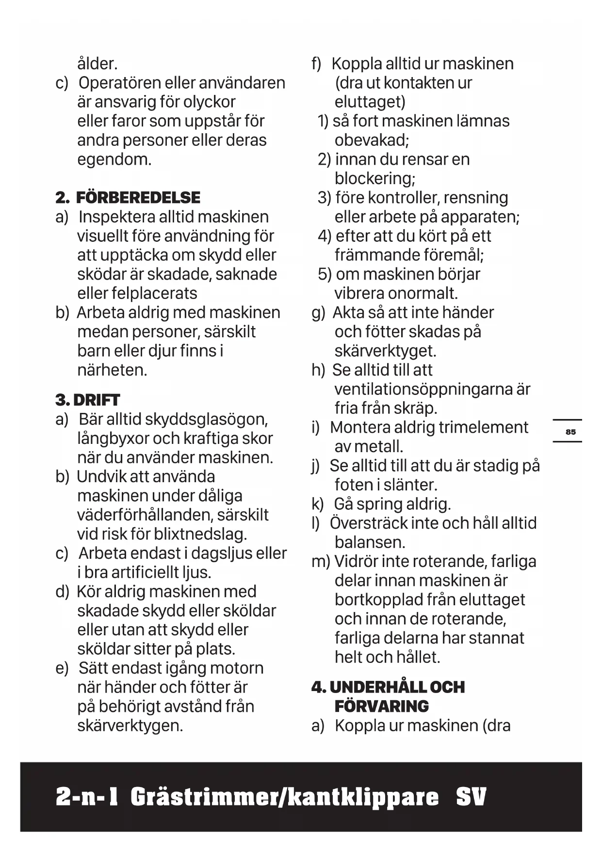 a) Läs igenom instruktionerna noggrant. Bekanta dig med kontroller och hur apparaten används korrekt. b) Låt aldrig barn, personer med nedsatt fysisk, sensorisk eller mental förmåga eller brist på erfarenhet och kunskap, eller personer som inte känner till dessa instruktioner, använda maskinen. Lokala föreskrifter kan begränsa operatörens2-n-1 Grästrimmer/kantklippare SV