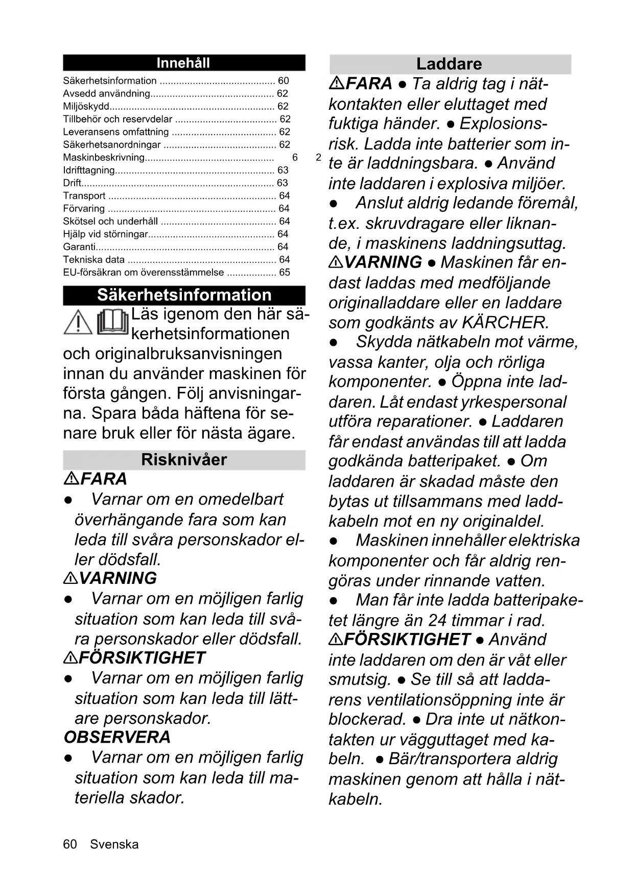 - dB(A) 84 84 Chairman of the Board of Management Director Regulatory Affairs & Certification H. Jenner S. Reiser 6YHQVND Innehåll Säkerhetsinformation Läs igenom den här sä- kerhetsinformationen och originalbruksanvisningen innan du använder maskinen för första gången. Följ anvisningar- na. Spara båda häftena för se- nare bruk eller för nästa ägare. Risknivåer FARA ● Varnar om en omedelbart överhängande fara som kan leda till svåra personskador el- ler dödsfall. 몇 VARNING ● Varnar om en möjligen farlig situation som kan leda till svå- ra personskador eller dödsfall. 몇 FÖRSIKTIGHET ● Varnar om en möjligen farlig situation som kan leda till lätt- are personskador. OBSERVERA ● Varnar om en möjligen farlig situation som kan leda till ma- teriella skador. Laddare FARA ● Ta aldrig tag i nät- kontakten eller eluttaget med fuktiga händer. ● Explosions- risk. Ladda inte batterier som in- te är laddningsbara. ● Använd inte laddaren i explosiva miljöer. ● Anslut aldrig ledande föremål, t.ex. skruvdragare eller liknan- de, i maskinens laddningsuttag. 몇 VARNING ● Maskinen får en- dast laddas med medföljande originalladdare eller en laddare som godkänts av KÄRCHER. ● Skydda nätkabeln mot värme, vassa kanter, olja och rörliga komponenter. ● Öppna inte lad- daren. Låt endast yrkespersonal utföra reparationer. ● Laddaren får endast användas till att ladda godkända batteripaket. ● Om laddaren är skadad måste den bytas ut tillsammans med ladd- kabeln mot en ny originaldel. ● Maskinen innehåller elektriska komponenter och får aldrig ren- göras under rinnande vatten. ● Man får inte ladda batteripake- tet längre än 24 timmar i rad. 몇 FÖRSIKTIGHET ● Använd inte laddaren om den är våt eller smutsig. ● Se till så att ladda- rens ventilationsöppning inte är blockerad. ● Dra inte ut nätkon- takten ur vägguttaget med ka- beln. ● Bär/transportera aldrig maskinen genom att hålla i nät- kabeln. Säkerhetsinformation p. 60