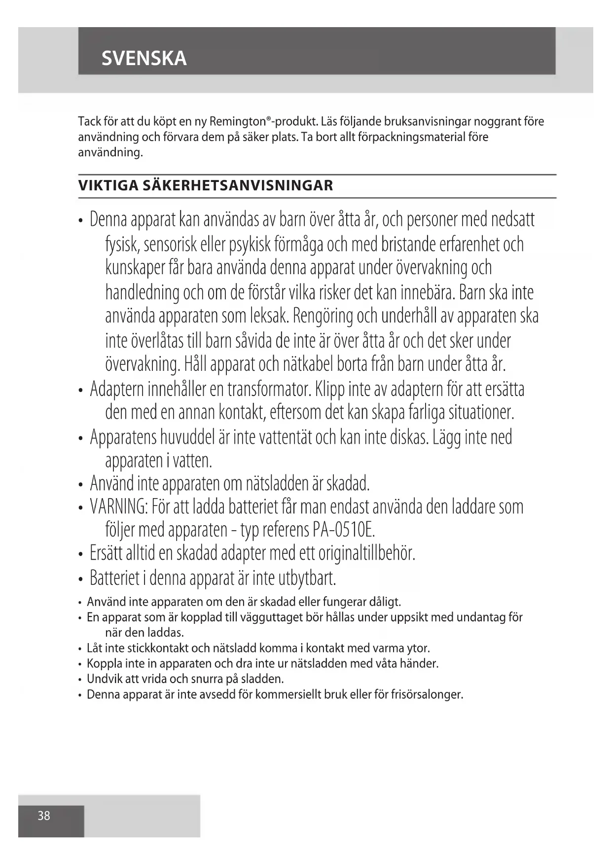 AE38 Tack för att du köpt en ny Remington®-produkt. Läs följande bruksanvisningar noggrant före användning och förvara dem på säker plats. Ta bort allt förpackningsmaterial före användning.