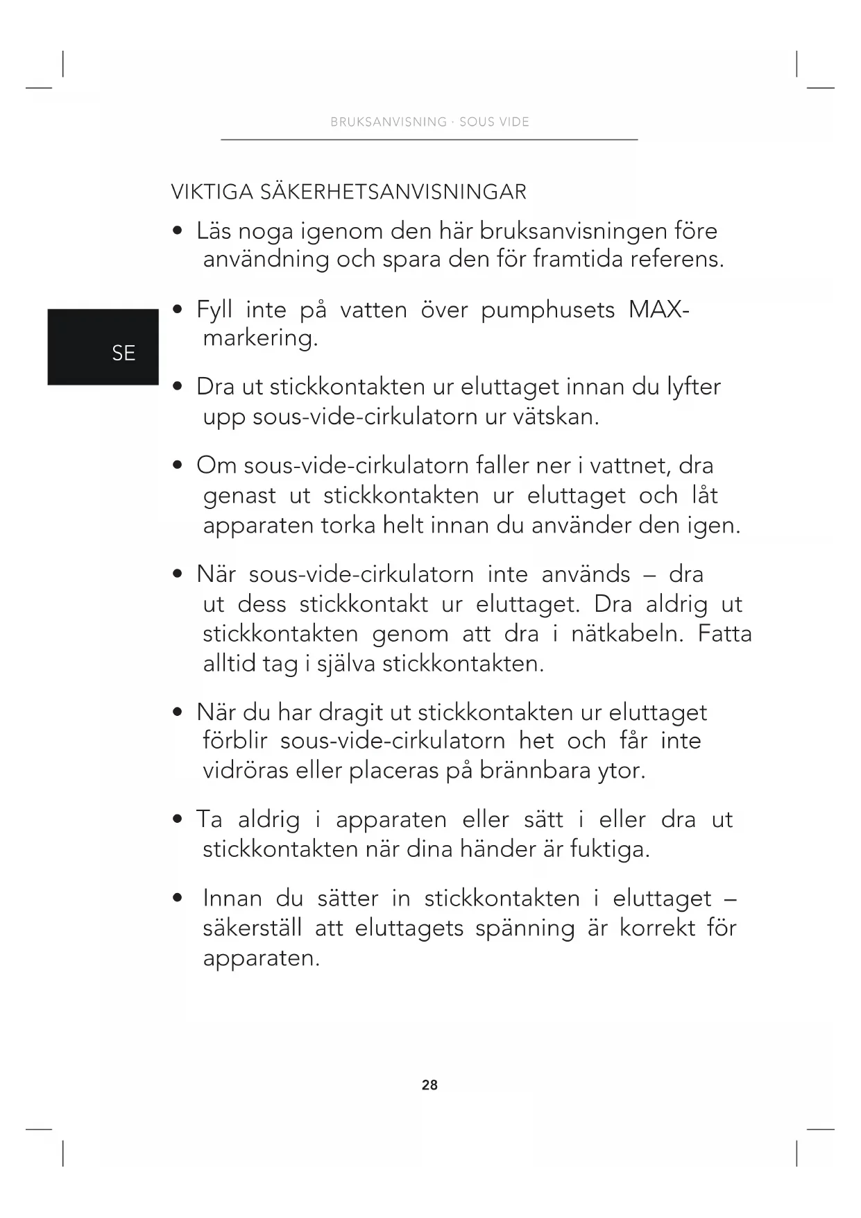 - Om sous-vide-cirkulatorn faller ner i vattnet, dra genast ut stickkontakten ur eluttaget och låt apparaten torka helt innan du använder den igen.