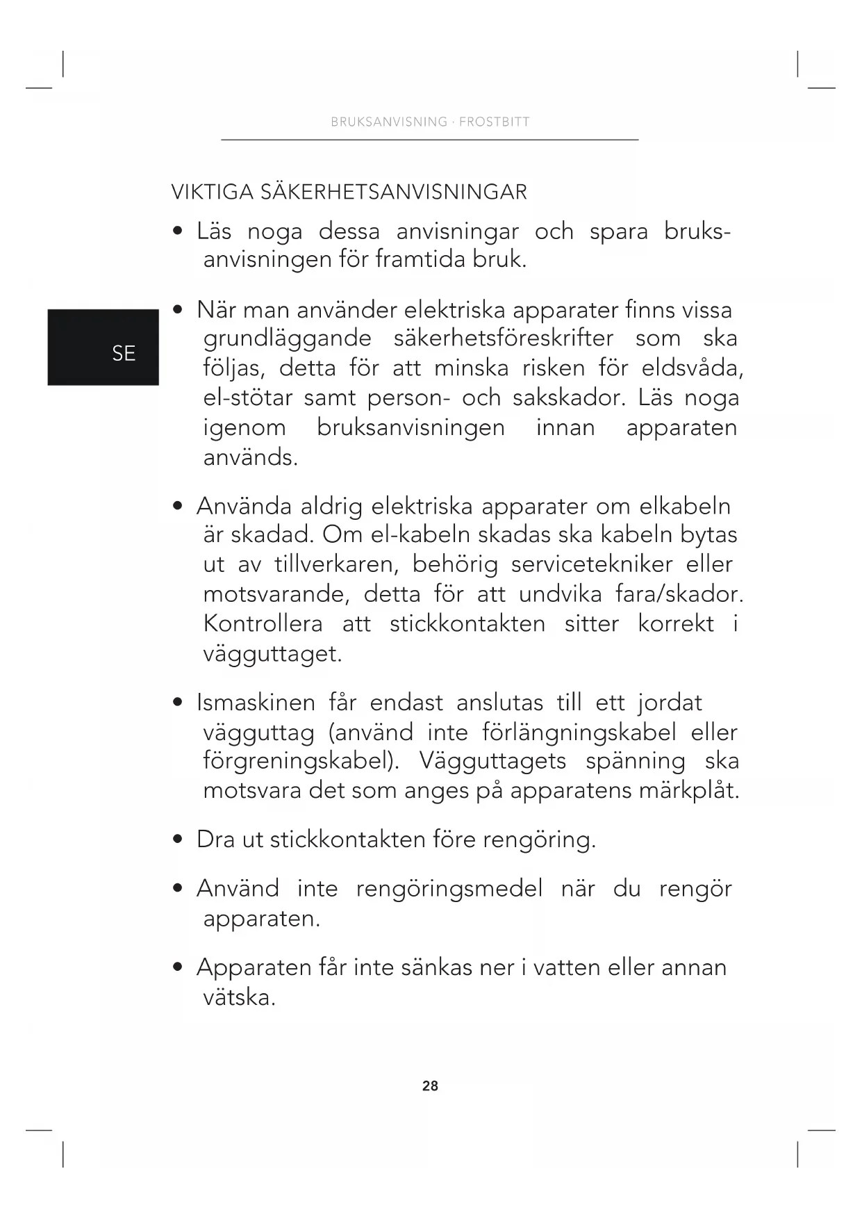 BRUKSANVISNING · FROSTBITT GARANTI Wilfa ger en garanti på fem (5) år på denna produkt från och med inköpsdatum. Garantin täcker tillverkningsfel eller defekter som uppstår under garantiperioden. Ditt inköpskvitto fungerar som bevis gentemot återförsäljaren om du åberopar garanti. Garantin gäller endast produkter som köps och används för privat bruk, för normala hushållsändamål. Garantin gäller inte om produkten används för kommersiella ändamål. Garantin gäller inte om produkten används felaktigt eller oaktsamt, om du underlåter att följa Wilfas anvisningar, om produkten har modierats eller om reparation har utförts av en icke auktoriserad person/ verkstad. Garantin omfattar vidare inte fel som uppstår till följd av normalt slitage, felaktig användning, bristande underhåll eller felaktig elektrisk spänning eller: