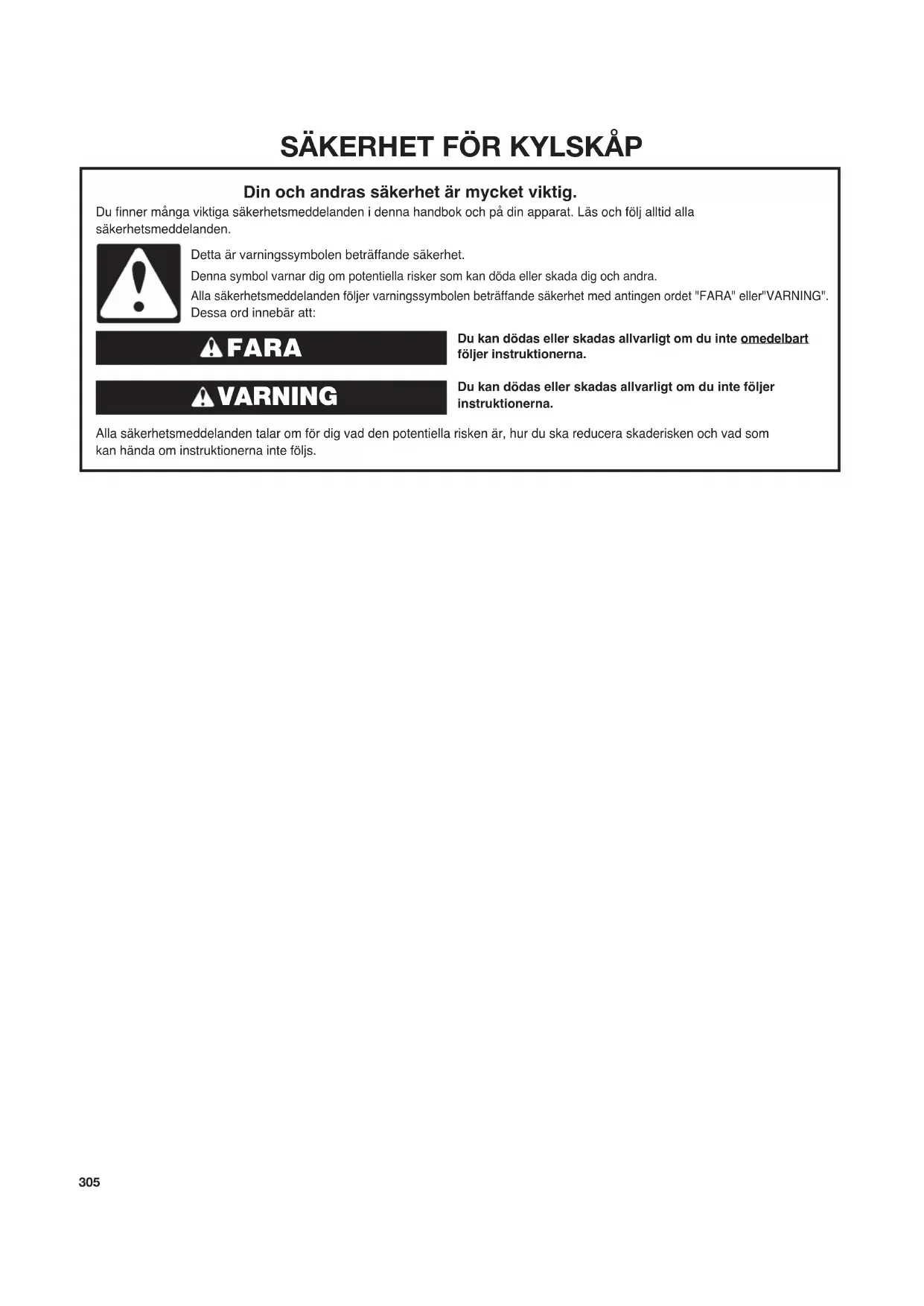 Du kan dödas eller skadas allvarligt om du inte omedelbart följer instruktionerna. Du kan dödas eller skadas allvarligt om du inte följer instruktionerna. Alla säkerhetsmeddelanden talar om för dig vad den potentiella risken är, hur du ska reducera skaderisken och vad som kan hända om instruktionerna inte följs. Din och andras säkerhet är mycket viktig. Du finner många viktiga säkerhetsmeddelanden i denna handbok och på din apparat. Läs och följ alltid alla säkerhetsmeddelanden. Detta är varningssymbolen beträffande säkerhet. Denna symbol varnar dig om potentiella risker som kan döda eller skada dig och andra. Alla säkerhetsmeddelanden följer varningssymbolen beträffande säkerhet med antingen ordet "FARA" eller"VARNING". Dessa ord innebär att: FARA VARNING323