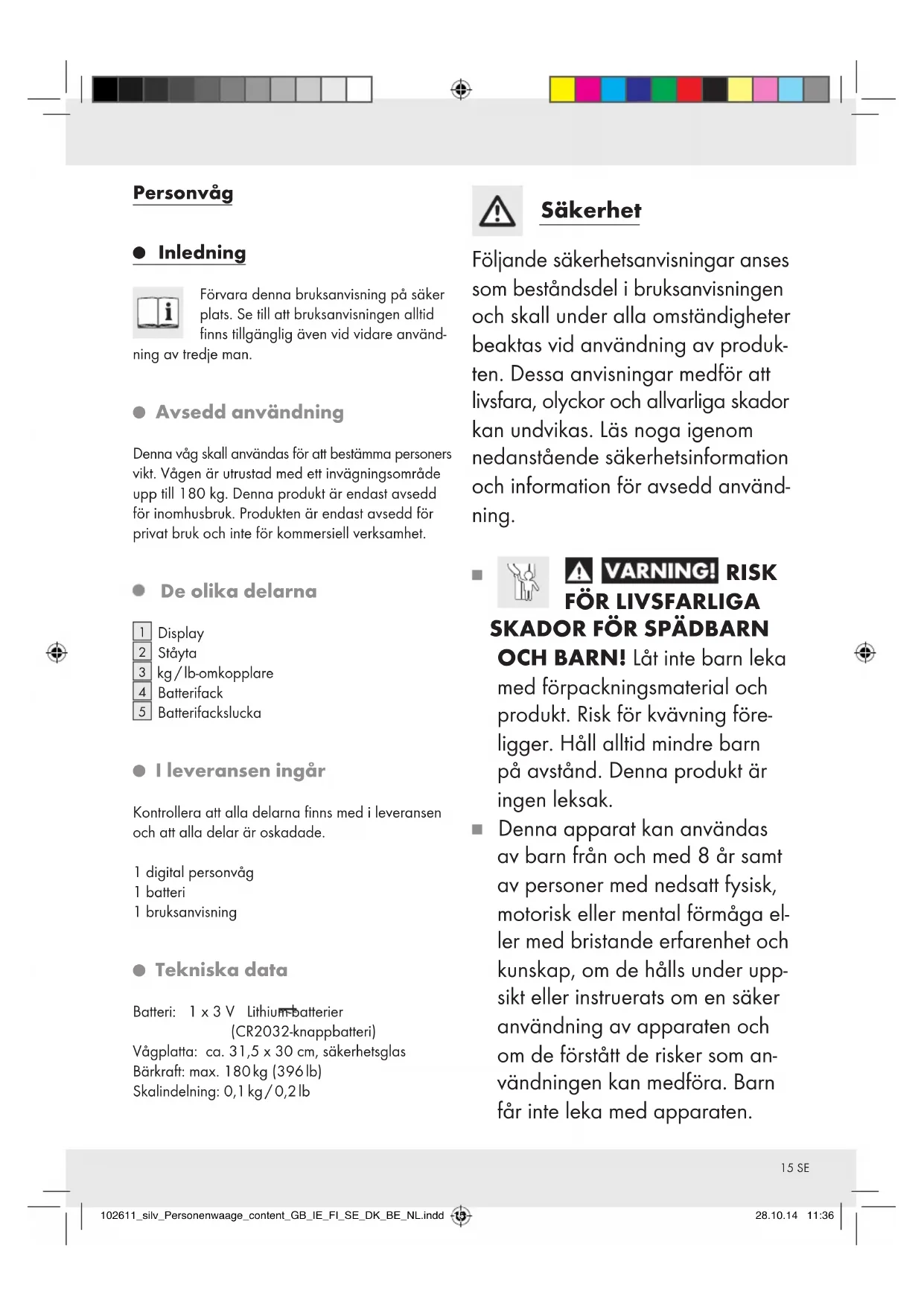 OCH BARN! Låt inte barn leka med förpackningsmaterial och produkt. Risk för kvävning före- ligger. Håll alltid mindre barn på avstånd. Denna produkt är ingen leksak. Denna apparat kan användas av barn från och med 8 år samt av personer med nedsatt fysisk, motorisk eller mental förmåga el- ler med bristande erfarenhet och kunskap, om de hålls under upp- sikt eller instruerats om en säker användning av apparaten och om de förstått de risker som an- vändningen kan medföra. Barn får inte leka med apparaten. 102611_silv_Personenwaage_content_GB_IE_FI_SE_DK_BE_NL.indd 15 28.10.14 11:3616 SE Rengöring och underhåll får inte utföras av barn utan uppsikt av vuxen person.