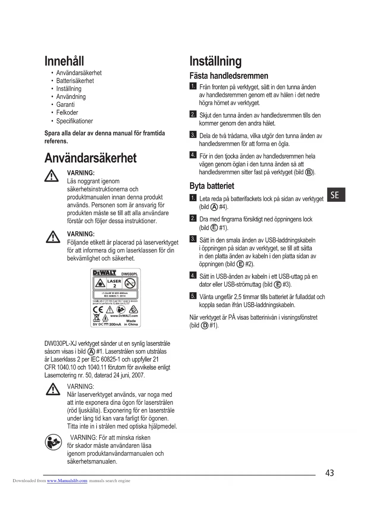 - Specikationer Spara alla delar av denna manual för framtida referens. Användarsäkerhet VARNING: Läs noggrant igenom säkerhetsinstruktionerna och produktmanualen innan denna produkt används. Personen som är ansvarig för produkten måste se till att alla användare förstår och följer dessa instruktioner. VARNING: Följande etikett är placerad på laserverktyget för att informera dig om laserklassen för din bekvämlighet och säkerhet. DW030PL-XJ verktyget sänder ut en synlig laserstråle såsom visas i bild