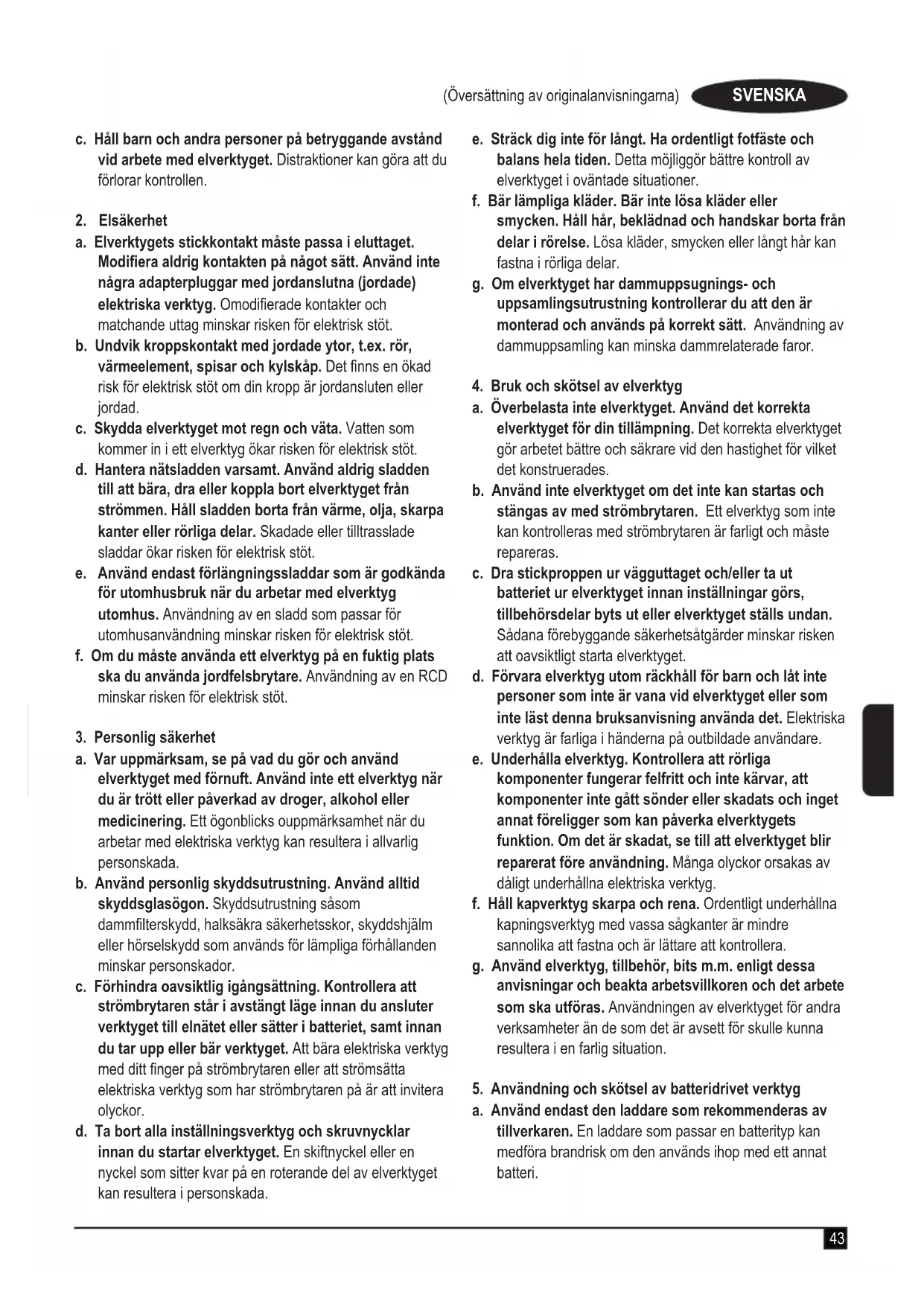 a. Se till att arbetsplatsen är obelamrad och välbelyst. Belamrade eller mörka områden inbjuder till olyckor. b. Använd inte elverktyget i explosionsfarlig omgivning, t.ex. i närheten av brännbara vätskor, gaser eller damm. Elektriska verktyg ge upphov till gnistor som kan antända dammet eller ångorna.43 (Översättning av originalanvisningarna) SVENSKA (Översättning av originalanvisningarna) c. Håll barn och andra personer på betryggande avstånd vid arbete med elverktyget. Distraktioner kan göra att du förlorar kontrollen.