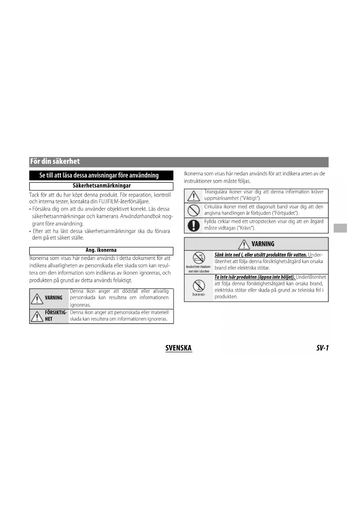 - Efter att ha läst dessa säkerhetsanmärkningar ska du förvara dem på ett säkert ställe. Ang. ikonerna Ikonerna som visas här nedan används i detta dokument för att indikera allvarligheten av personskada eller skada som kan resul- tera om den information som indikeras av ikonen ignoreras, och produkten på grund av detta används felaktigt. VARNING Denna ikon anger att dödsfall eller allvarlig personskada kan resultera om informationen ignoreras. FÖRSIKTIG- HET Denna ikon anger att personskada eller materiell skada kan resultera om informationen ignoreras. Ikonerna som visas här nedan används för att indikera arten av de instruktioner som måste följas. Triangulära ikoner visar dig att denna information kräver uppmärksamhet (”Viktigt”). Cirkulära ikoner med ett diagonalt band visar dig att den angivna handlingen är förbjuden (”Förbjudet”). Fyllda cirklar med ett utropstecken visar dig att en åtgärd måste vidtagas (”Krävs”).