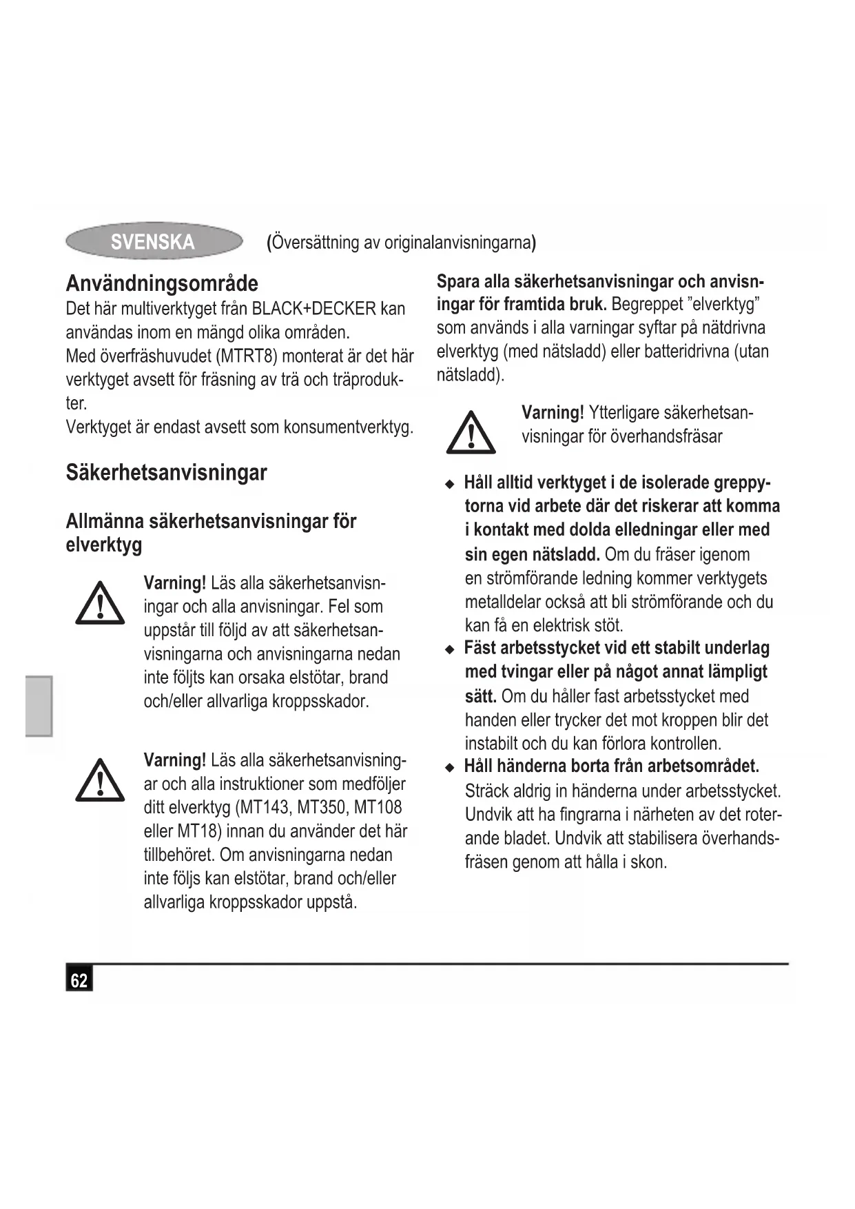 MTRT8 Black & Decker garanterar att produkterna som beskrivs under ”Tekniska data” uppfyller: 2006/42/EG, EN60745-1, EN60745-2-17 De här produkterna överensstämmer även med direktiven 2014/30/EU och 2011/65/EU. Mer information får du genom att kontakta Black & Decker på följande adress eller titta i slutet av bruksanvisningen. Undertecknad är ansvarig för sammanställningen av tekniska data och gör denna försäkran för Black & Decker. R. Laverick Engineering Manager Black & Decker Europe, 210 Bath Road, Slough, Berkshire, SL1 3YD Storbritannien 17/09/201469 (Oversettelse av de opprinnelige instruksjonene) NORSK Bruksområde Dette erbruksverktøyet fra BLACK+DECKER er konstruert for mange typer gjør det selv-oppgaver. Sammen med fresehodet (MTRT8) kan dette verktøyet brukes til å frese tre og treprodukter. Verktøyet er bare tiltenkt bruk som et forbruk- erverktøy. Sikkerhetsinstruksjoner Generelle sikkerhetsadvarsler for elektro- verktøy