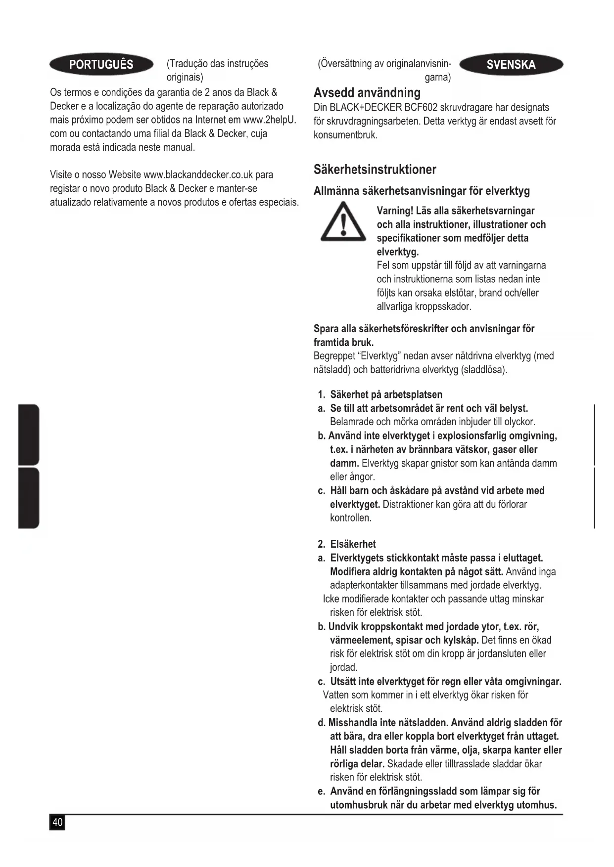 BCF602 - skruvdragare Black & Decker garanterar att produkterna som beskrivs under ”Tekniska data” uppfyller: 2006/42/EG, EN62841-1:2015, EN62841-2-2:2014. Dessa produkter överensstämmer även med direktiven 2014/30/EU och 2011/65/EU. För ytterligare information kontakta Black & Decker på följande adress, eller se handbokens baksida. Undertecknad är ansvarig för sammanställningen av tekniska data och gör denna försäkran för Black & Decker. R. Laverick Engineering Manager Black & Decker Europe, 210 Bath Road, Slough, Berkshire, SL1 3YD Storbritannien 2018-04-10 Garanti Black & Decker är säker på kvaliteten hos denna produkt och erbjuder kunder 24 månaders garanti från inköpsdatumet. Garantin gäller utöver konsumentens rättigheter enligt lag och påverkar inte dessa. Garantin är giltig i de områden som tillhör medlemsstaterna i Europeiska unionen och det europeiska frihandelsområdet. För yrkande under garantin måste yrkandet vara in enlighet med Black & Deckers villkor och du kommer att behöva skicka in bevis på köpet till försäljaren eller en auktoriserad reparatör.45 (Översättning av originalan- visningarna) SVENSKA (Oversettelse av de opprinnelige instruksjonene) NORSK Villkoren för Black & Deckers tvååriga garanti och var du hittar din närmaste auktoriserade reparatör kan erhållas på internet på www.2helpU.com, eller genom att kontakta ditt lokala Black & Deckers kontor på adressen som anges i denna manual. Besök vår webbplats www.blackanddecker.se för att registrera din nya Black & Decker-produkt samt för att få information om nya produkter och specialerbjudanden. Tiltenkt bruk BLACK+DECKER BCF602 skrujern er designet for skrujernbruk. Dette verktøyet er bare ment som et forbrukerverktøy. Sikkerhetsinstruksjoner Generelle sikkerhetsadvarsler for elektroverktøy Advarsel! Les alle sikkerhetsadvarsler og alle instruksjoner, illustrasjoner og spesikasjoner som følger med dette verktøyet. Hvis advarslene og anvisningene nedenfor ikke overholdes, kan det medføre elektrisk støt, brann og/eller alvorlige personskader. Ta vare på alle advarsler og instruksjoner for fremtidig bruk. Uttrykket “elektroverktøy” i alle advarslene nedenfor gjelder for strømdrevne elektroverktøy (med ledning) og batteridrevne elektroverktøy (uten ledning).