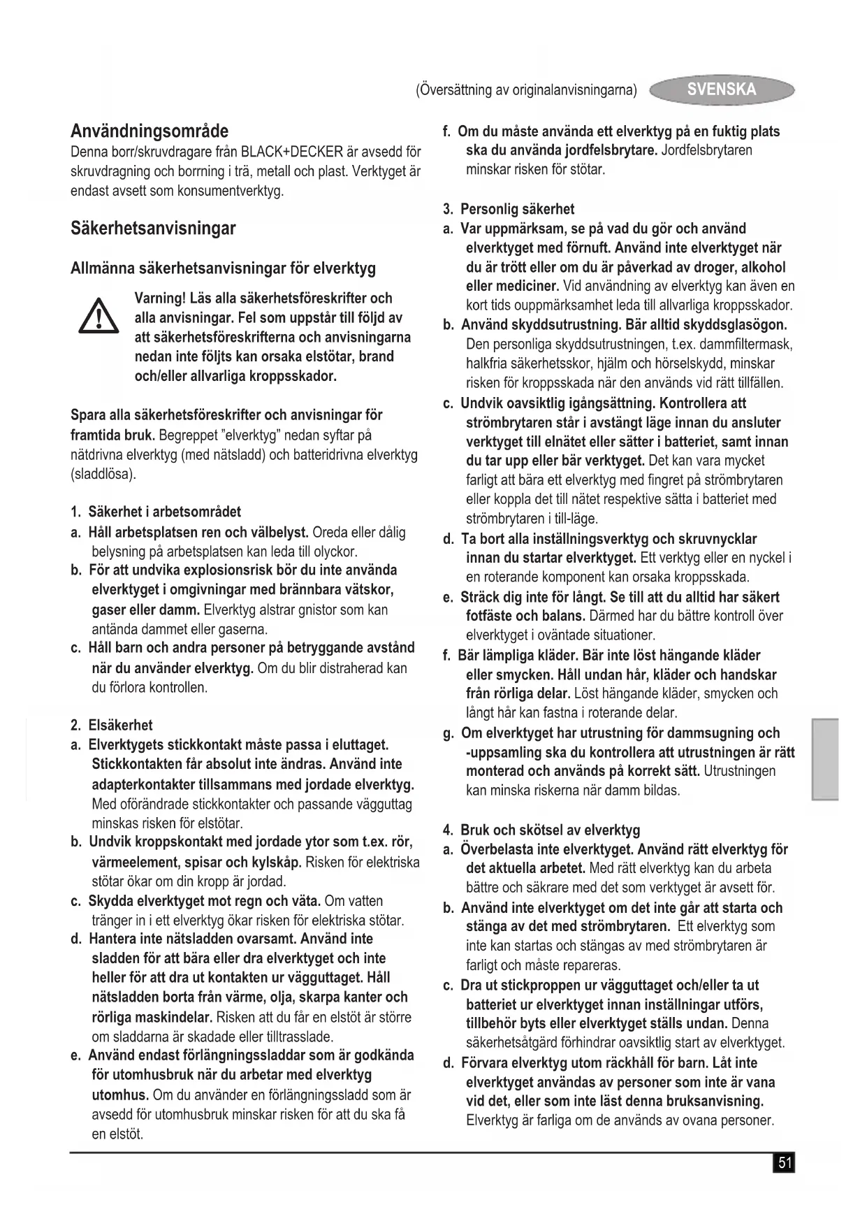 EGBL14, EGBL18 Black & Decker garanterar att produkterna som beskrivs under "Tekniska data" uppfyller: 2006/42/EG, EN 60745-1, EN 60745-2-1 Garanti Black & Decker garanterar att produkten är fri från material- och/eller fabrikationsfel vid leverans till kund. Garantin gäller utöver konsumentens rättigheter enligt lag och påverkar inte dessa. Garantin gäller inom medlemsstaterna i Europeiska Unionen och i det Europeiska Frihandelsområdet. Om en Black & Decker-produkt går sönder på grund av material- och/eller fabrikationsfel eller brister i överensstämmelse med specikationen, inom 24 månader från köpet, åtar sig Black & Decker att reparera eller byta ut produkten med minsta besvär för kunden, förutom om: u Produkten har använts i kommersiellt eller yrkesmässigt syfte eller i uthyrningssyfte. u Produkten har utsatts för felaktig användning eller skötsel.u Produkten har skadats av främmande föremål, ämnen eller genom olyckshändelse. u Reparation har utförts av någon annan än en auktoriserad Black & Decker-verkstad. Vid garantianspråk ska produkten och inköpskvittot lämnas till återförsäljaren eller till en auktoriserad verkstad. För information om närmaste auktoriserade verkstad, kontakta det lokala Black & Decker-kontoret på den adress som är angiven i bruksanvisningen. En lista över alla auktoriserade verkstäder samt servicevillkor nns på Internet: www.2helpU.com Besök vår webbplats www.blackanddecker.se för att registrera din nya BLACK+DECKER-produkt samt för att erhålla information om nya produkter och specialerbjudanden. Vidare information om märket BLACK+ DECKER och vårt produktsortiment åternns på www. blackanddecker.se De här produkterna överensstämmer även med direktiven 2014/30/EU och 2011/65/EU. Mer information får du genom att kontakta Black & Decker på följande adress eller titta i slutet av bruksanvisningen. Undertecknad är ansvarig för sammanställningen av tekniska data och gör denna försäkran för Black & Decker. R. Laverick Engineering Manager Black & Decker Europe, 210 Bath Road, Slough, Berkshire, SL1 3YD Storbritannien 05/09/201457 (Oversettelse av de opprinnelige instruksjonene) NORSK Bruksområde Din drill/skrutrekker fra BLACK+DECKER er utformet for bruk som skrutrekker og for boring i tre, metall og plast. Verktøyet er beregnet bare som konsumentverktøy. Sikkerhetsinstruksjoner Generelle sikkerhetsadvarsler for elektroverktøy