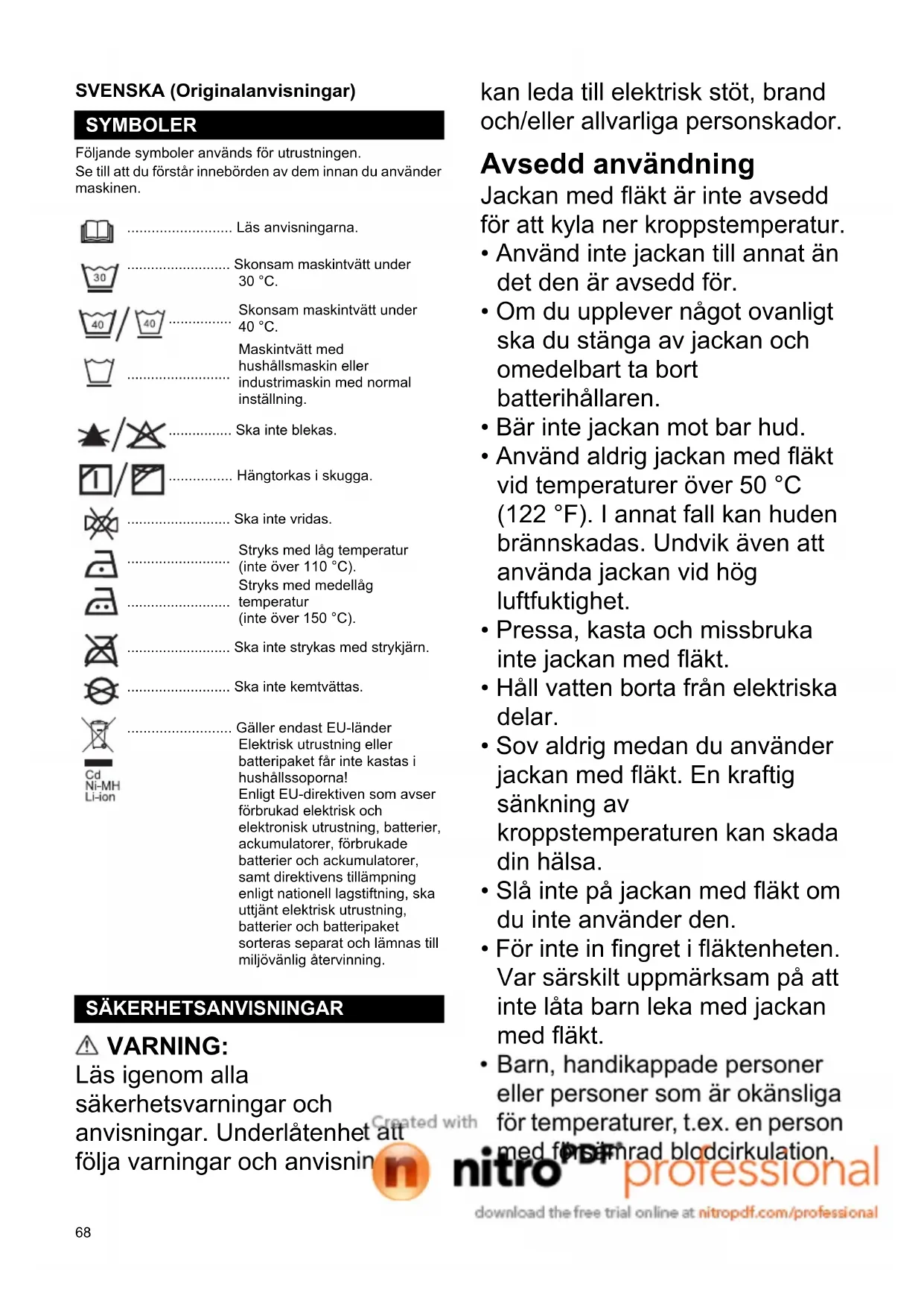 Stryks med medellåg temperatur (inte över 150 °C). .......................... Ska inte strykas med strykjärn. .......................... Ska inte kemtvättas. .......................... Gäller endast EU-länder Elektrisk utrustning eller batteripaket får inte kastas i hushållssoporna! Enligt EU-direktiven som avser förbrukad elektrisk och elektronisk utrustning, batterier, ackumulatorer, förbrukade batterier och ackumulatorer, samt direktivens tillämpning enligt nationell lagstiftning, ska uttjänt elektrisk utrustning, batterier och batteripaket sorteras separat och lämnas till miljövänlig återvinning. SÄKERHETSANVISNINGAR69 ska avstå från att använda jackan.