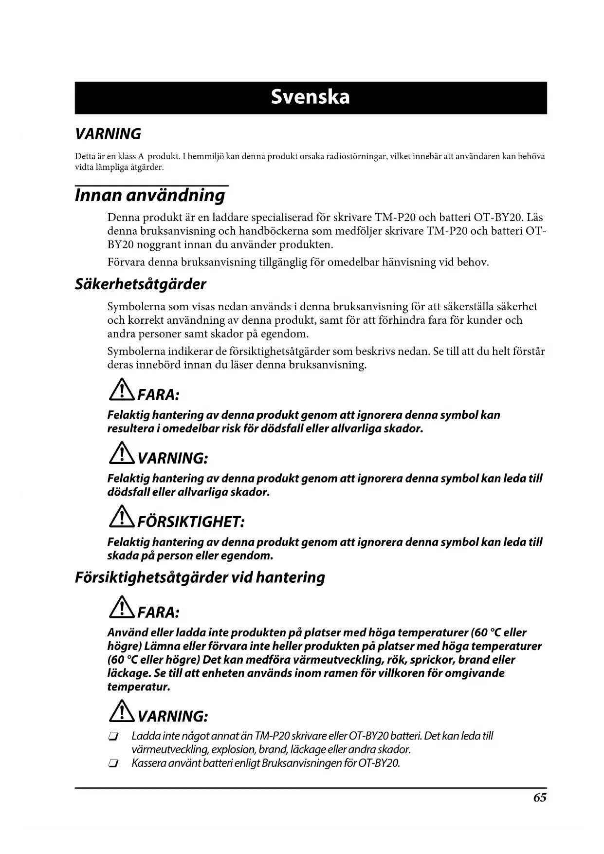Ca. 3 timer Temperatur/fuktighet Under bruk 0 til 40°C, 10 til 90% RH Under oppbevaring Høy temperatur og fuktighet: 50°C, 90% RH i 120 timer Høy temperatur: 70°C i 120 timer Lav temperatur: -25°C i 120 timer Eksterne dimensjoner ( W × D × H) 110 × 133 × 64 mm Vekt Ca. 0.3 kg65 Svenska VARNING Detta är en klass A-produkt. I hemmiljö kan denna produkt orsaka radiostörningar, vilket innebär att användaren kan behöva vidta lämpliga åtgärder. Innan användning Denna produkt är en laddare specialiserad för skrivare TM-P20 och batteri OT-BY20. Läs denna bruksanvisning och handböckerna som medföljer skrivare TM-P20 och batteri OT- BY20 noggrant innan du använder produkten.Förvara denna bruksanvisning tillgänglig för omedelbar hänvisning vid behov. Säkerhetsåtgärder Symbolerna som visas nedan används i denna bruksanvisning för att säkerställa säkerhet och korrekt användning av denna produkt, samt för att förhindra fara för kunder och andra personer samt skador på egendom.Symbolerna indikerar de försiktighetsåtgärder som beskrivs nedan. Se till att du helt förstår deras innebörd innan du läser denna bruksanvisning. !FARA: Felaktig hantering av denna produkt genom att ignorera denna symbol kan resultera i omedelbar risk för dödsfall eller allvarliga skador. !VARNING: Felaktig hantering av denna produkt genom att ignorera denna symbol kan leda till dödsfall eller allvarliga skador. !FÖRSIKTIGHET: Felaktig hantering av denna produkt genom att ignorera denna symbol kan leda till skada på person eller egendom. Försiktighetsåtgärder vid hantering !FARA: Använd eller ladda inte produkten på platser med höga temperaturer (60 °C eller högre) Lämna eller förvara inte heller produkten på platser med höga temperaturer (60 °C eller högre) Det kan medföra värmeutveckling, rök, sprickor, brand eller läckage. Se till att enheten används inom ramen för villkoren för omgivande temperatur. !VARNING: