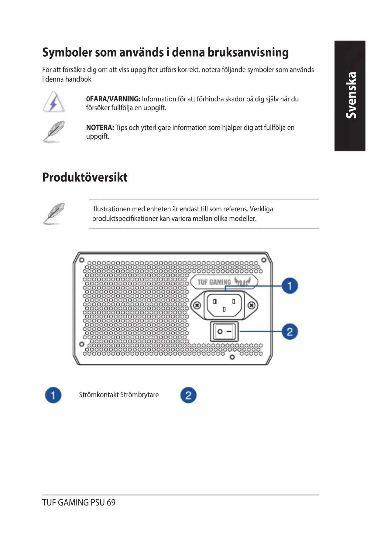 - Neupoštevanje navodil proizvajalca in varnostnih navodil nemudoma izniči vsa jamstva in garancije. R45625 RoHSTUF GAMING PSU 69 Svenska Svenska Symboler som används i denna bruksanvisning För att försäkra dig om att viss uppgifter utförs korrekt, notera följande symboler som används i denna handbok. 0FARA/VARNING: Information för att förhindra skador på dig själv när du försöker fullfölja en uppgift. NOTERA: Tips och ytterligare information som hjälper dig att fullfölja en uppgift. Produktöversikt Illustrationen med enheten är endast till som referens. Verkliga produktspecikationer kan variera mellan olika modeller. Strömkontakt StrömbrytareTUF GAMING PSU70 Svenska Innan du sätter i eller tar bort kablar måste systemet stängas av, och alla elkablar till systemet och alla anslutna enheter vara frånkopplade.