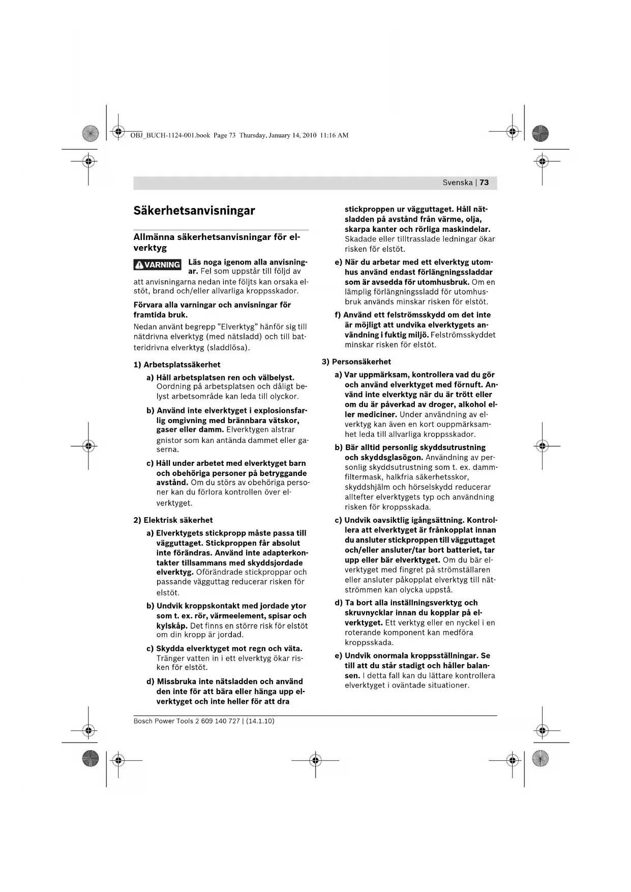 a) Var uppmärksam, kontrollera vad du gör och använd elverktyget med förnuft. An- vänd inte elverktyg när du är trött eller om du är påverkad av droger, alkohol el- ler mediciner. Under användning av el- verktyg kan även en kort ouppmärksam- het leda till allvarliga kroppsskador. b) Bär alltid personlig skyddsutrustning och skyddsglasögon. Användning av per- sonlig skyddsutrustning som t. ex. damm- filtermask, halkfria säkerhetsskor, skyddshjälm och hörselskydd reducerar alltefter elverktygets typ och användning risken för kroppsskada. c) Undvik oavsiktlig igångsättning. Kontrol- lera att elverktyget är frånkopplat innan du ansluter stickproppen till vägguttaget och/eller ansluter/tar bort batteriet, tar upp eller bär elverktyget. Om du bär el- verktyget med fingret på strömställaren eller ansluter påkopplat elverktyg till nät- strömmen kan olycka uppstå. d) Ta bort alla inställningsverktyg och skruvnycklar innan du kopplar på el- verktyget. Ett verktyg eller en nyckel i en roterande komponent kan medföra kroppsskada. e) Undvik onormala kroppsställningar. Se till att du står stadigt och håller balan- sen. I detta fall kan du lättare kontrollera elverktyget i oväntade situationer. VARNING OBJ_BUCH-1124-001.book Page 73 Thursday, January 14, 2010 11:16 AM74 | Svenska 2 609 140 727 | (14.1.10) Bosch Power Tools f) Bär lämpliga arbetskläder. Bär inte löst hängande kläder eller smycken. Håll hå- ret, kläderna och handskarna på avstånd från rörliga delar. Löst hängande kläder, långt hår och smycken kan dras in av rote- rande delar. g) Vid elverktyg med dammutsugnings- och -uppsamlingsutrustning, se till att denna är rätt monterade och används på kor- rekt sätt. Användning av dammutsugning minskar de risker damm orsakar.