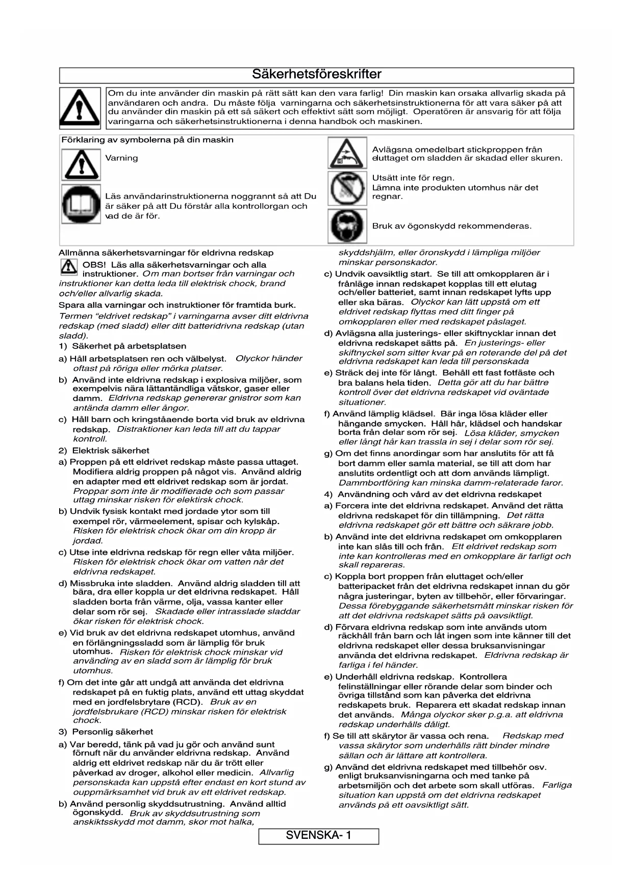 a) Forcera inte det eldrivna redskapet. Använd det rätta eldrivna redskapet för din tillämpning. Det rätta eldrivna redskapet gör ett bättre och säkrare jobb. b) Använd inte det eldrivna redskapet om omkopplaren inte kan slås till och från. Ett eldrivet redskap som inte kan kontrolleras med en omkopplare är farligt och skall repareras. c) Koppla bort proppen från eluttaget och/eller batteripacket från det eldrivna redskapet innan du gör några justeringar, byten av tillbehör, eller förvaringar. Dessa förebyggande säkerhetsmått minskar risken för att det eldrivna redskapet sätts på oavsiktligt. d) Förvara eldrivna redskap som inte används utom räckhåll från barn och låt ingen som inte känner till det eldrivna redskapet eller dessa bruksanvisningar använda det eldrivna redskapet. Eldrivna redskap är farliga i fel händer. e) Underhåll eldrivna redskap. Kontrollera felinställningar eller rörande delar som binder och övriga tillstånd som kan påverka det eldrivna redskapets bruk. Reparera ett skadat redskap innan det används. Många olyckor sker p.g.a. att eldrivna redskap underhålls dåligt. f) Se till att skärytor är vassa och rena. Redskap med vassa skärytor som underhålls rätt binder mindre sällan och är lättare att kontrollera. g) Använd det eldrivna redskapet med tillbehör osv. enligt bruksanvisningarna och med tanke på arbetsmiljön och det arbete som skall utföras. Farliga situation kan uppstå om det eldrivna redskapet används på ett oavsiktligt sätt. Om du inte använder din maskin på rätt sätt kan den vara farlig! Din maskin kan orsaka allvarlig skada på användaren och andra. Du måste följa varningarna och säkerhetsinstruktionerna för att vara säker på att du använder din maskin på ett så säkert och effektivt sätt som möjligt. Operatören är ansvarig för att följa varingarna och säkerhetsinstruktionerna i denna handbok och maskinen. SVENSKA- 1 Förklaring av symbolerna på din maskin
