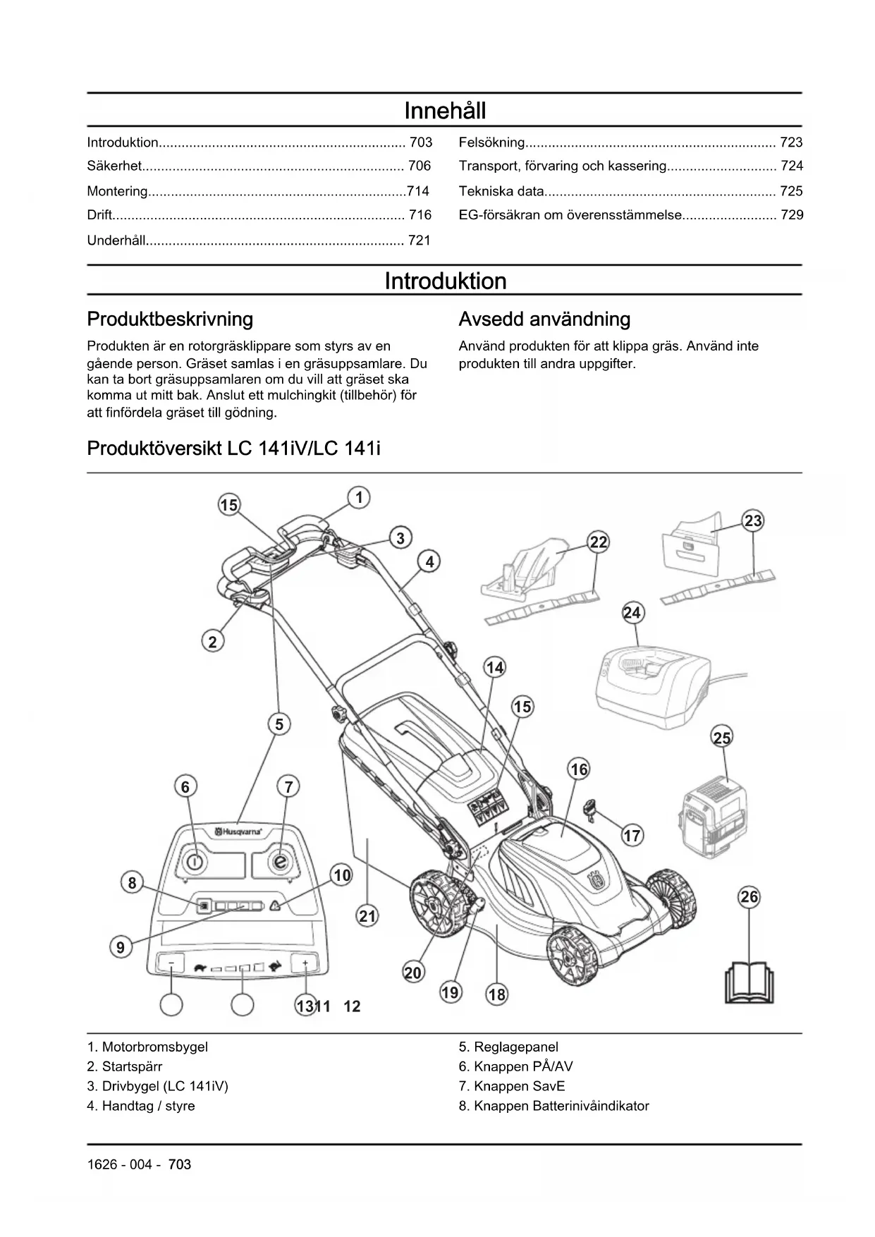 - EG‐försäkran om överensstämmelse Introduktion Produktbeskrivning Produkten är en rotorgräsklippare som styrs av en gående person. Gräset samlas i en gräsuppsamlare. Du kan ta bort gräsuppsamlaren om du vill att gräset ska komma ut mitt bak. Anslut ett mulchingkit (tillbehör) för att finfördela gräset till gödning. Avsedd användning Använd produkten för att klippa gräs. Använd inte produkten till andra uppgifter. Produktöversikt LC 141iV/LC 141i p. 729