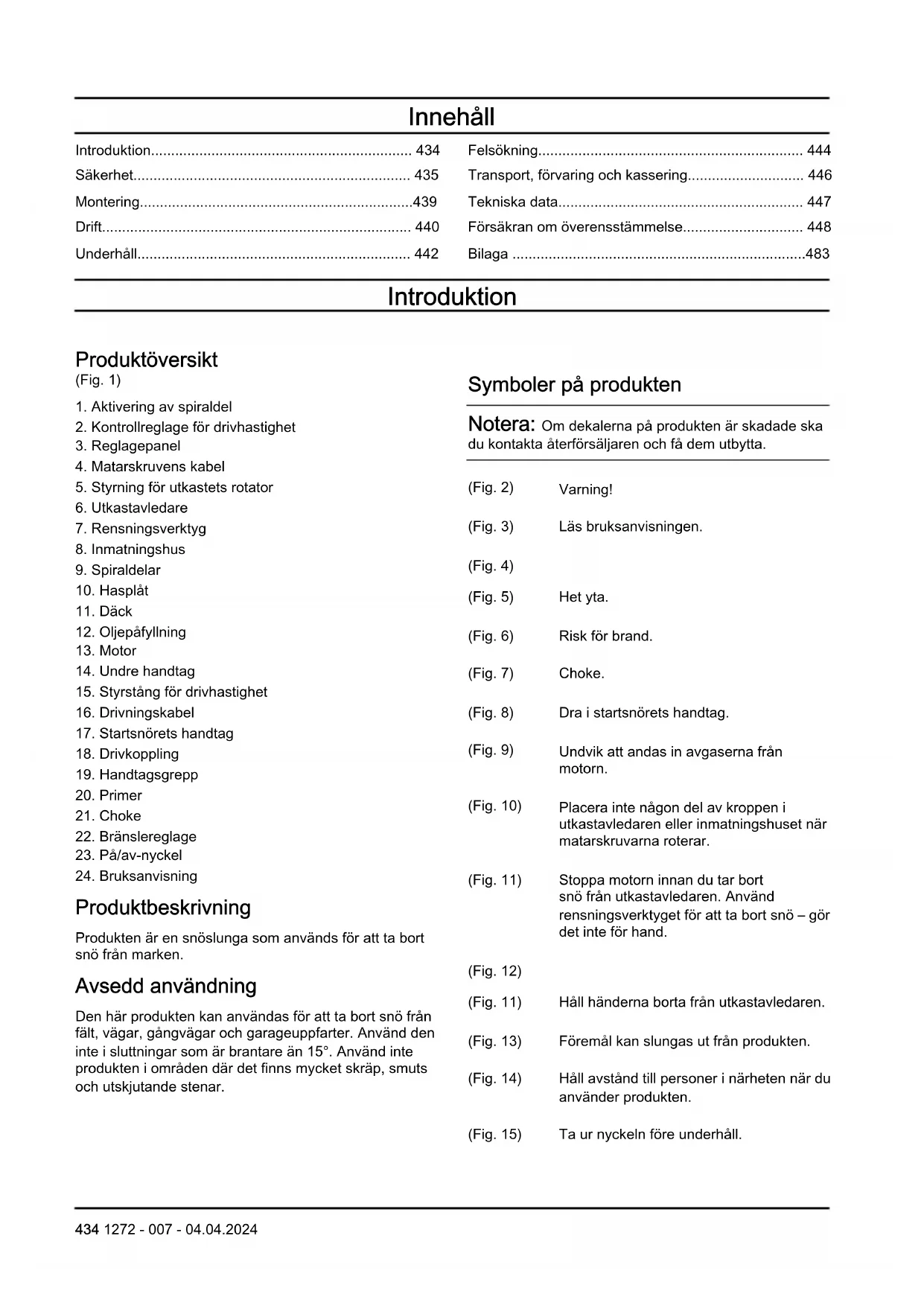 Produktbeskrivning Produkten är en snöslunga som används för att ta bort snö från marken. Avsedd användning Den här produkten kan användas för att ta bort snö från fält, vägar, gångvägar och garageuppfarter. Använd den inte i sluttningar som är brantare än 15°. Använd inte produkten i områden där det finns mycket skräp, smuts och utskjutande stenar. Symboler på produkten Notera: Om dekalerna på produkten är skadade ska du kontakta återförsäljaren och få dem utbytta. (Fig. 2) Varning! (Fig. 3) Läs bruksanvisningen. (Fig. 4) (Fig. 5) Het yta. (Fig. 6) Risk för brand. (Fig. 7) Choke. (Fig. 8) Dra i startsnörets handtag. (Fig. 9) Undvik att andas in avgaserna från motorn. (Fig. 10) Placera inte någon del av kroppen i utkastavledaren eller inmatningshuset när matarskruvarna roterar. (Fig. 11) Stoppa motorn innan du tar bort snö från utkastavledaren. Använd rensningsverktyget för att ta bort snö – gör det inte för hand. (Fig. 12) (Fig. 11) Håll händerna borta från utkastavledaren. (Fig. 13) Föremål kan slungas ut från produkten. (Fig. 14) Håll avstånd till personer i närheten när du använder produkten. (Fig. 15) Ta ur nyckeln före underhåll. 434 1272 - 007 - 04.04.2024(Fig. 16) Tryck in på/av-nyckeln till KÖR-läget. (Fig. 17) Vrid bränslereglaget till läget PÅ. (Fig. 18) Tryck på primern. (Fig. 19) Fallrisk. (Fig. 20) Flytta långsamt bakåt. (Fig. 21) Använd godkända skyddshandskar. (Fig. 22) Använd skyddshjälm. Använd godkända hörselskydd. Använd godkänt ögonskydd. (Fig. 23) Emission av buller i miljön enligt EU- direktiv 2000/14/EC och New South Wales ”Protection of the Environment Operations (Noise Control) Regulation 2017”. Information om bulleremission finns på maskinens etikett och i avsnittet Tekniska data. (Fig. 24) Produkten överensstämmer med gällande EG-direktiv. (Fig. 25) Denna produkt överensstämmer med gällande brittiska direktiv. Notera: Övriga symboler/dekaler på produkten avser specifika krav för certifieringar på vissa marknader. Euro V-utsläpp VARNING: Manipulering av motorn upphäver EG-typgodkännandet för den här produkten. Tillverkare Husqvarna AB Drottninggatan 2, SE-561 82 Huskvarna Produktskada Vi ansvarar inte för skador på vår produkt om:
