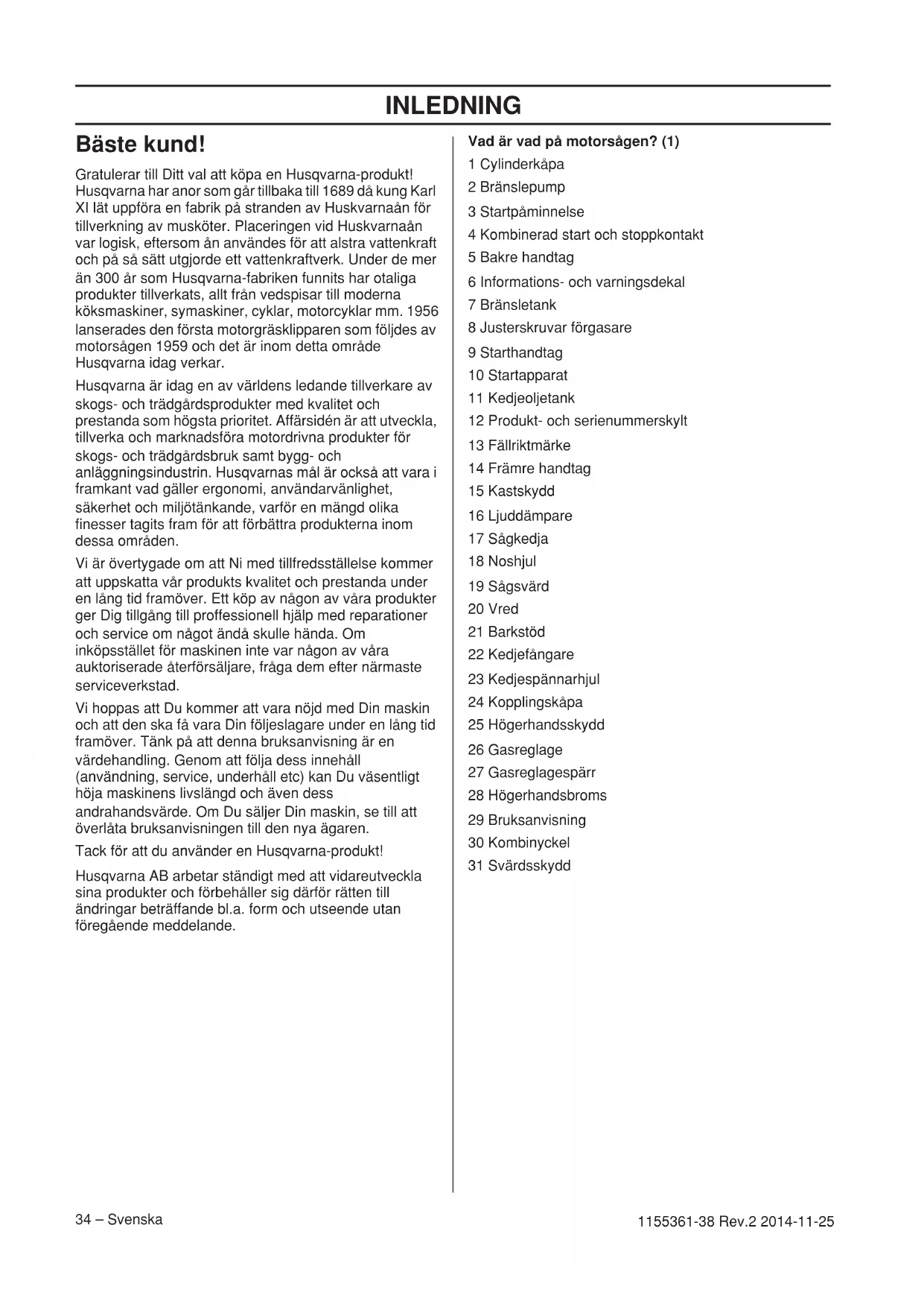 - EG-försäkran om överensstämmelse INLEDNING 34 – Svenska 1155361-38 Rev.2 2014-11-25 Bäste kund! Gratulerar till Ditt val att köpa en Husqvarna-produkt! Husqvarna har anor som går tillbaka till 1689 då kung Karl XI lät uppföra en fabrik på stranden av Huskvarnaån för tillverkning av musköter. Placeringen vid Huskvarnaån var logisk, eftersom ån användes för att alstra vattenkraft och på så sätt utgjorde ett vattenkraftverk. Under de mer än 300 år som Husqvarna-fabriken funnits har otaliga produkter tillverkats, allt från vedspisar till moderna köksmaskiner, symaskiner, cyklar, motorcyklar mm. 1956 lanserades den första motorgräsklipparen som följdes av motorsågen 1959 och det är inom detta område Husqvarna idag verkar. Husqvarna är idag en av världens ledande tillverkare av skogs- och trädgårdsprodukter med kvalitet och prestanda som högsta prioritet. Affärsidén är att utveckla, tillverka och marknadsföra motordrivna produkter för skogs- och trädgårdsbruk samt bygg- och anläggningsindustrin. Husqvarnas mål är också att vara i framkant vad gäller ergonomi, användarvänlighet, säkerhet och miljötänkande, varför en mängd olika finesser tagits fram för att förbättra produkterna inom dessa områden. Vi är övertygade om att Ni med tillfredsställelse kommer att uppskatta vår produkts kvalitet och prestanda under en lång tid framöver. Ett köp av någon av våra produkter ger Dig tillgång till proffessionell hjälp med reparationer och service om något ändå skulle hända. Om inköpsstället för maskinen inte var någon av våra auktoriserade återförsäljare, fråga dem efter närmaste serviceverkstad. Vi hoppas att Du kommer att vara nöjd med Din maskin och att den ska få vara Din följeslagare under en lång tid framöver. Tänk på att denna bruksanvisning är en värdehandling. Genom att följa dess innehåll (användning, service, underhåll etc) kan Du väsentligt höja maskinens livslängd och även dess andrahandsvärde. Om Du säljer Din maskin, se till att överlåta bruksanvisningen till den nya ägaren. Tack för att du använder en Husqvarna-produkt! Husqvarna AB arbetar ständigt med att vidareutveckla sina produkter och förbehåller sig därför rätten till ändringar beträffande bl.a. form och utseende utan föregående meddelande. Vad är vad på motorsågen? (1) 1 Cylinderkåpa 2 Bränslepump 3 Startpåminnelse 4 Kombinerad start och stoppkontakt 5 Bakre handtag 6 Informations- och varningsdekal 7 Bränsletank 8 Justerskruvar förgasare 9 Starthandtag 10 Startapparat 11 Kedjeoljetank 12 Produkt- och serienummerskylt 13 Fällriktmärke 14 Främre handtag 15 Kastskydd 16 Ljuddämpare 17 Sågkedja 18 Noshjul 19 Sågsvärd 20 Vred 21 Barkstöd 22 Kedjefångare 23 Kedjespännarhjul 24 Kopplingskåpa 25 Högerhandsskydd 26 Gasreglage 27 Gasreglagespärr 28 Högerhandsbroms 29 Bruksanvisning 30 Kombinyckel 31 SvärdsskyddALLMÄNNA SÄKERHETSINSTRUKTIONER Svenska – 35 1155361-38 Rev.2 2014-11-25 Åtgärder före användning av ny motorsåg p. 56