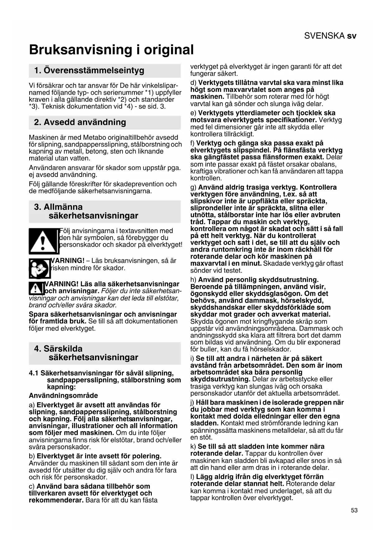Bruksanvisning i original Vi försäkrar och tar ansvar för De här vinkelslipar- named följande typ- och serienummer *1) uppfyller kraven i alla gällande direktiv *2) och standarder *3). Teknisk dokumentation vid *4) - se sid. 3. Maskinen är med Metabo originaltillbehör avsedd för slipning, sandpappersslipning, stålborstning och kapning av metall, betong, sten och liknande material utan vatten. Användaren ansvarar för skador som uppstår pga. ej avsedd användning. Följ gällande föreskrifter för skadeprevention och de medföljande säkerhetsanvisningarna. Följ anvisningarna i textavsnitten med den här symbolen, så förebygger du personskador och skador på elverktyget! VARNING! – Läs bruksanvisningen, så är risken mindre för skador. VARNING! Läs alla säkerhetsanvisningar och anvisningar. Följer du inte säkerhetsan- visningar och anvisningar kan det leda till elstötar, brand och/eller svåra skador. Spara säkerhetsanvisningar och anvisningar för framtida bruk. Se till så att dokumentationen följer med elverktyget.