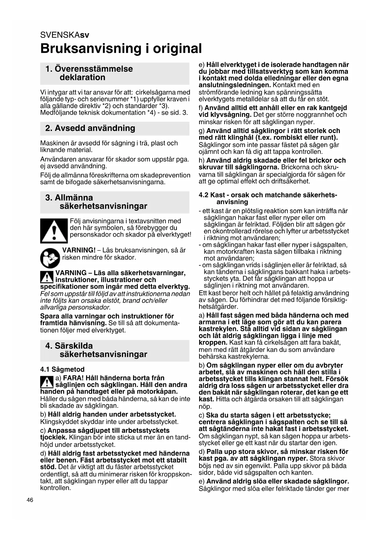 Bruksanvisning i original Vi intygar att vi tar ansvar för att: cirkelsågarna med följande typ- och serienummer *1) uppfyller kraven i alla gällande direktiv *2) och standarder *3). Medföljande teknisk dokumentation *4) - se sid. 3. Maskinen är avsedd för sågning i trä, plast och liknande material. Användaren ansvarar för skador som uppstår pga. ej avsedd användning. Följ de allmänna föreskrifterna om skadeprevention samt de bifogade säkerhetsanvisningarna. Följ anvisningarna i textavsnitten med den här symbolen, så förebygger du personskador och skador på elverktyget! VARNING! – Läs bruksanvisningen, så är risken mindre för skador. VARNING – Läs alla säkerhetsvarningar, instruktioner, illustrationer och specifikationer som ingår med detta elverktyg. Fel som uppstår till följd av att instruktionerna nedan inte följts kan orsaka elstöt, brand och/eller allvarliga personskador. Spara alla varningar och instruktioner för framtida hänvisning. Se till så att dokumenta- tionen följer med elverktyget.