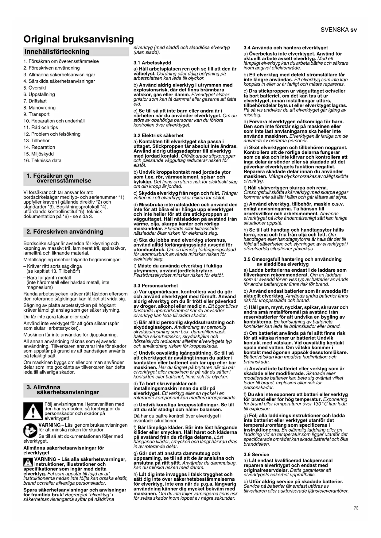 Vi försäkrar och tar ansvar för att: bordscirkelsågar med typ- och serienummer *1) uppfyller kraven i gällande direktiv *2) och standarder *3). Besiktningsprotokoll *4), utfärdande kontrollinstitut *5), teknisk dokumentation på *6) - se sida 3. Bordscirkelsågar är avsedda för klyvning och kapning av massivt trä, laminerat trä, spånskivor, lamellträ och liknande material. Metallsågning innebär följande begränsningar: – Kräver rätt sorts sågklinga (se kapitlet 13. Tillbehör“) – Bara för järnfri metall (inte hårdmetall eller härdad metall, inte magnesium) Runda arbetsstycken kräver rätt fästdon eftersom den roterande sågklingan kan få det att vrida sig. Sågning av platta arbetsstycken på högkant kräver lämpligt anslag som ger säker styrning. Du får inte göra falsar eller spår. Använd inte verktyget för att göra slitsar (spår som slutar i arbetsstycket). Maskinen får inte användas för djupskärning. All annan användning räknas som ej avsedd användning. Tillverkaren ansvarar inte för skador som uppstår på grund av att bandsågen använts på felaktigt sätt. Om maskinen byggs om eller om man använder delar som inte godkänts av tillverkaren kan detta leda till allvarliga skador. Följ anvisningarna i textavsnitten med den här symbolen, så förebygger du personskador och skador på elverktyget! VARNING – Läs igenom bruksanvisningen för att minska risken för skador. Se till så att dokumentationen följer med elverktyget. Allmänna säkerhetsanvisningar för elverktyget VARNING – Läs alla säkerhetsvarningar, instruktioner, illustrationer och specifikationer som ingår med detta elverktyg. Fel som uppstår till följd av att instruktionerna nedan inte följts kan orsaka elstöt, brand och/eller allvarliga personskador. Spara säkerhetsanvisningar och anvisningar för framtida bruk! Begreppet ”elverktyg” i säkerhetsanvisningarna syftar på nätdrivna elverktyg (med sladd) och sladdlösa elverktyg (utan sladd).