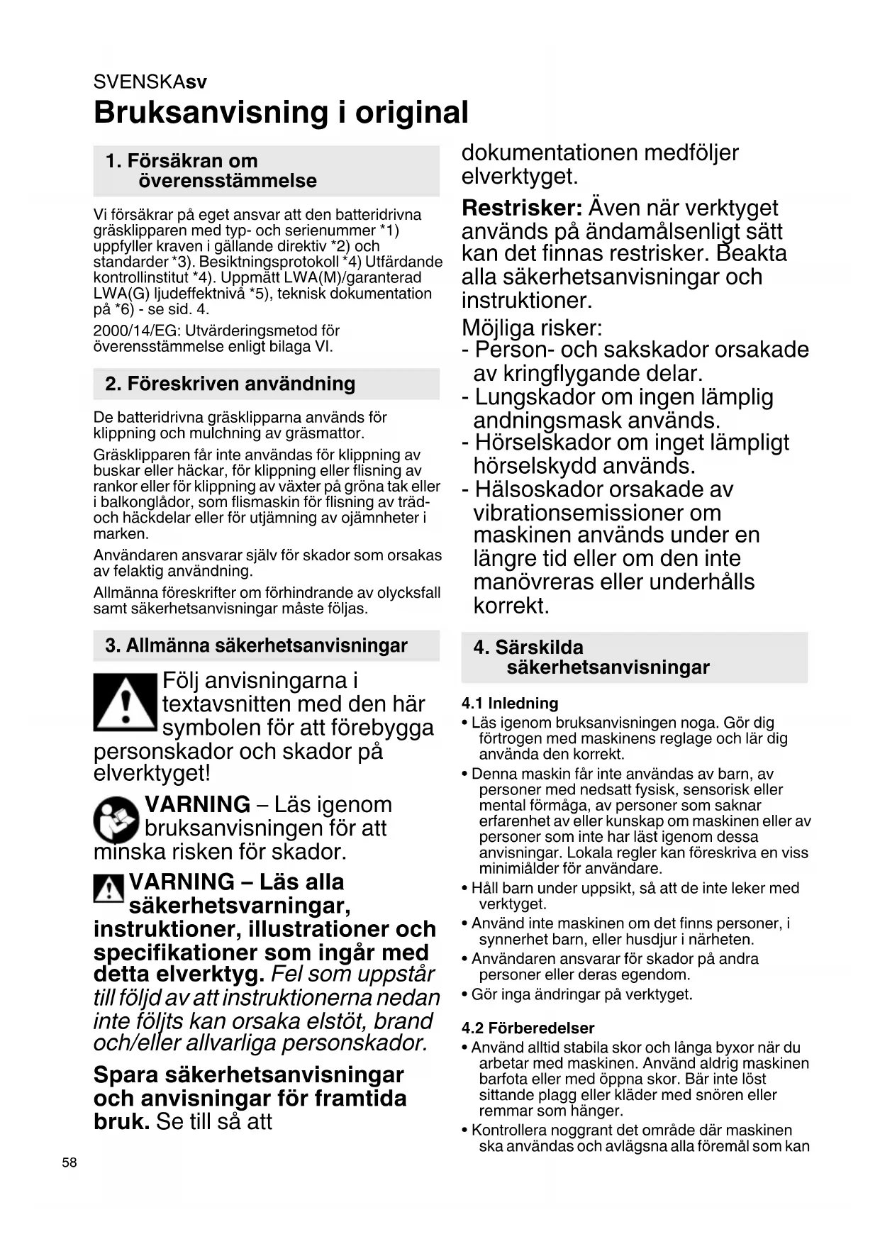 Bruksanvisning i original Vi försäkrar på eget ansvar att den batteridrivna gräsklipparen med typ- och serienummer *1) uppfyller kraven i gällande direktiv *2) och standarder *3). Besiktningsprotokoll *4) Utfärdande kontrollinstitut *4). Uppmätt LWA(M)/garanterad LWA(G) ljudeffektnivå *5), teknisk dokumentation på *6) - se sid. 4. 2000/14/EG: Utvärderingsmetod för överensstämmelse enligt bilaga VI. De batteridrivna gräsklipparna används för klippning och mulchning av gräsmattor. Gräsklipparen får inte användas för klippning av buskar eller häckar, för klippning eller flisning av rankor eller för klippning av växter på gröna tak eller i balkonglådor, som flismaskin för flisning av träd- och häckdelar eller för utjämning av ojämnheter i marken. Användaren ansvarar själv för skador som orsakas av felaktig användning. Allmänna föreskrifter om förhindrande av olycksfall samt säkerhetsanvisningar måste följas. Följ anvisningarna i textavsnitten med den här symbolen för att förebygga personskador och skador på elverktyget! VARNING – Läs igenom bruksanvisningen för att minska risken för skador. VARNING – Läs alla säkerhetsvarningar, instruktioner, illustrationer och specifikationer som ingår med detta elverktyg. Fel som uppstår till följd av att instruktionerna nedan inte följts kan orsaka elstöt, brand och/eller allvarliga personskador. Spara säkerhetsanvisningar och anvisningar för framtida bruk. Se till så att dokumentationen medföljer elverktyget. Restrisker: Även när verktyget används på ändamålsenligt sätt kan det finnas restrisker. Beakta alla säkerhetsanvisningar och instruktioner. Möjliga risker: - Person- och sakskador orsakade av kringflygande delar. - Lungskador om ingen lämplig andningsmask används. - Hörselskador om inget lämpligt hörselskydd används. - Hälsoskador orsakade av vibrationsemissioner om maskinen används under en längre tid eller om den inte manövreras eller underhålls korrekt.