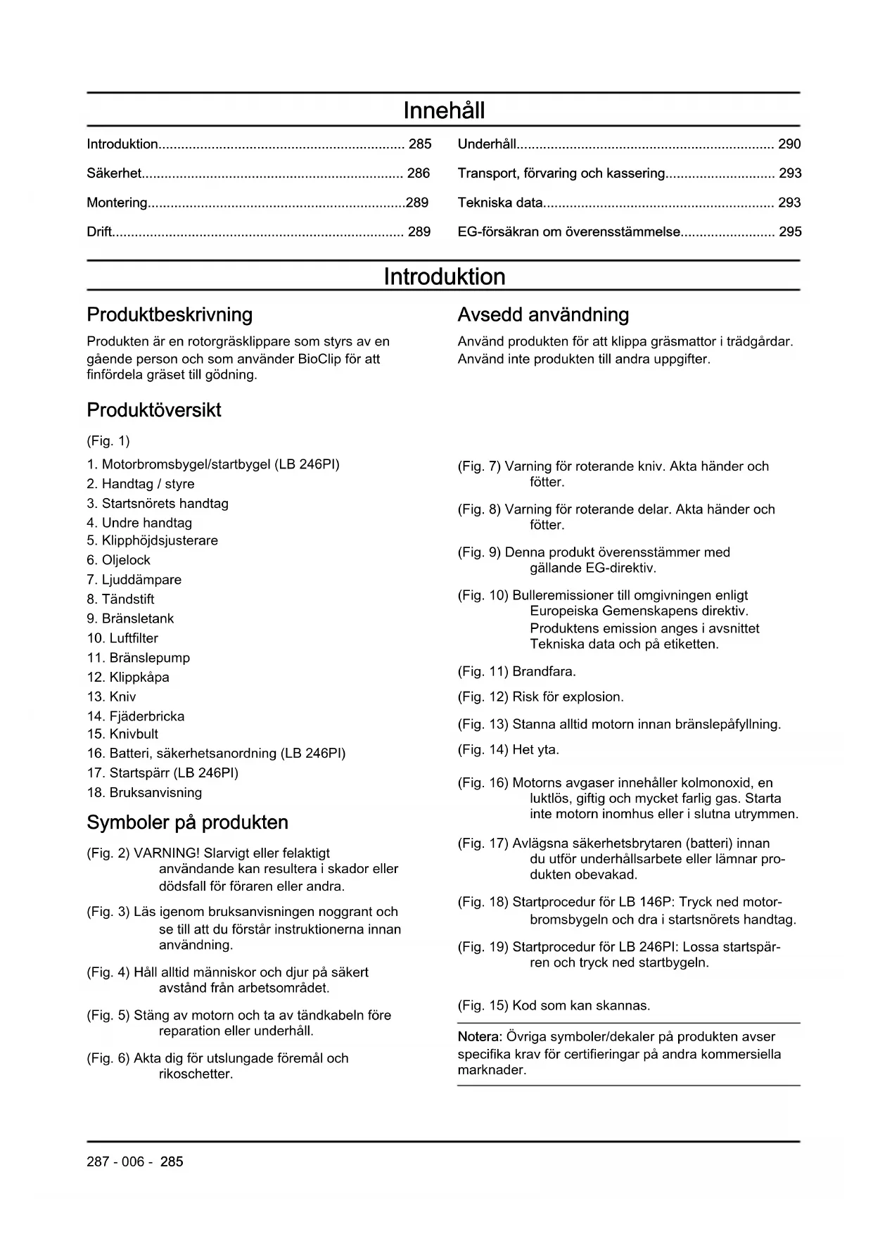 Symboler på produkten (Fig. 2) VARNING! Slarvigt eller felaktigt användande kan resultera i skador eller dödsfall för föraren eller andra. (Fig. 3) Läs igenom bruksanvisningen noggrant och se till att du förstår instruktionerna innan användning. (Fig. 4) Håll alltid människor och djur på säkert avstånd från arbetsområdet. (Fig. 5) Stäng av motorn och ta av tändkabeln före reparation eller underhåll. (Fig. 6) Akta dig för utslungade föremål och rikoschetter. (Fig. 7) Varning för roterande kniv. Akta händer och fötter. (Fig. 8) Varning för roterande delar. Akta händer och fötter. (Fig. 9) Denna produkt överensstämmer med gällande EG-direktiv. (Fig. 10) Bulleremissioner till omgivningen enligt Europeiska Gemenskapens direktiv. Produktens emission anges i avsnittet Tekniska data och på etiketten. (Fig. 11) Brandfara. (Fig. 12) Risk för explosion. (Fig. 13) Stanna alltid motorn innan bränslepåfyllning. (Fig. 14) Het yta. (Fig. 16) Motorns avgaser innehåller kolmonoxid, en luktlös, giftig och mycket farlig gas. Starta inte motorn inomhus eller i slutna utrymmen. (Fig. 17) Avlägsna säkerhetsbrytaren (batteri) innan du utför underhållsarbete eller lämnar pro- dukten obevakad. (Fig. 18) Startprocedur för LB 146P: Tryck ned motor- bromsbygeln och dra i startsnörets handtag. (Fig. 19) Startprocedur för LB 246PI: Lossa startspär- ren och tryck ned startbygeln. (Fig. 15) Kod som kan skannas. Notera: Övriga symboler/dekaler på produkten avser specifika krav för certifieringar på andra kommersiella marknader.