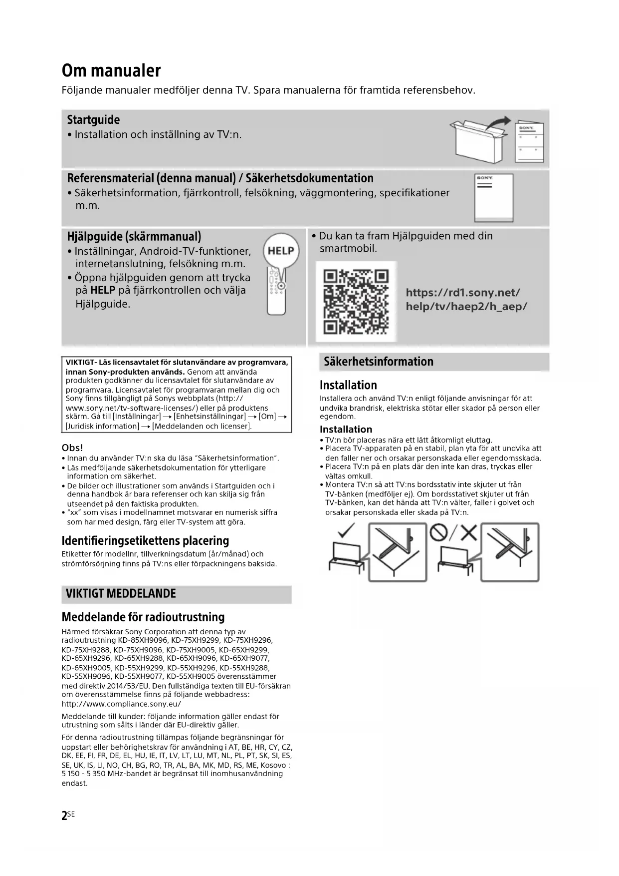 - Innan du använder TV:n ska du läsa “Säkerhetsinformation”.• Läs medföljande säkerhetsdokumentation för ytterligare information om säkerhet.• De bilder och illustrationer som används i Startguiden och i denna handbok är bara referenser och kan skilja sig från utseendet på den faktiska produkten.• “xx” som visas i modellnamnet motsvarar en numerisk siffra som har med design, färg eller TV-system att göra. Identifieringsetikettens placering Etiketter för modellnr, tillverkningsdatum (år/månad) och strömförsörjning finns på TV:ns eller förpackningens baksida. VIKTIGT MEDDELANDE Meddelande för radioutrustning Härmed försäkrar Sony Corporation att denna typ av radioutrustning KD-85XH9096, KD-75XH9299, KD-75XH9296, KD-75XH9288, KD-75XH9096, KD-75XH9005, KD-65XH9299, KD-65XH9296, KD-65XH9288, KD-65XH9096, KD-65XH9077, KD-65XH9005, KD-55XH9299, KD-55XH9296, KD-55XH9288, KD-55XH9096, KD-55XH9077, KD-55XH9005 överensstämmer med direktiv 2014/53/EU. Den fullständiga texten till EU-försäkran om överensstämmelse finns på följande webbadress: http://www.compliance.sony.eu/Meddelande till kunder: följande information gäller endast för utrustning som sålts i länder där EU-direktiv gäller.För denna radioutrustning tillämpas följande begränsningar för uppstart eller behörighetskrav för användning i AT, BE, HR, CY, CZ, DK, EE, FI, FR, DE, EL, HU, IE, IT, LV, LT, LU, MT, NL, PL, PT, SK, SI, ES, SE, UK, IS, LI, NO, CH, BG, RO, TR, AL, BA, MK, MD, RS, ME, Kosovo :5 150 - 5 350 MHz-bandet är begränsat till inomhusanvändning endast. Säkerhetsinformation Installation Installera och använd TV:n enligt följande anvisningar för att undvika brandrisk, elektriska stötar eller skador på person eller egendom. Installation