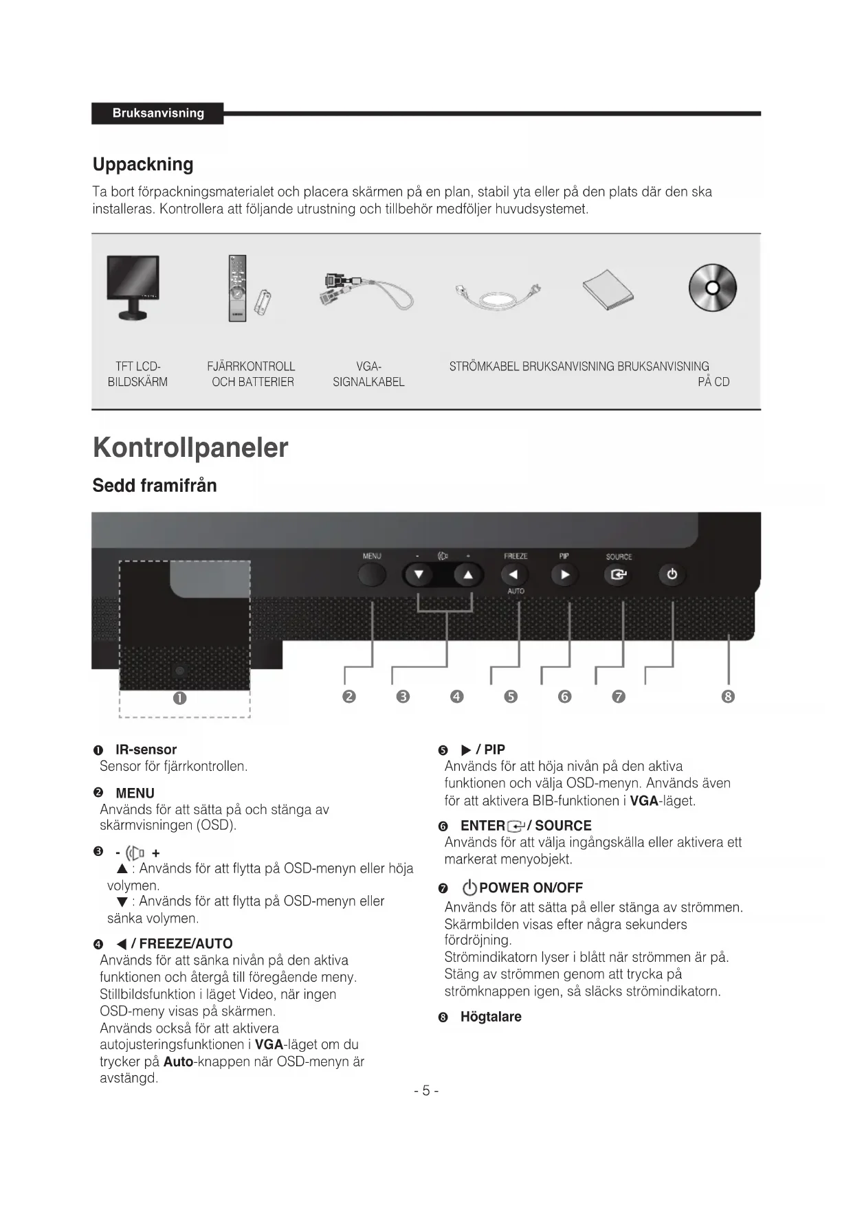Bruksanvisning FREEZE – tillgängligt i Video A/B- och S-Video-läget Tryck på knappen en gång om du vill frysa bilden. Stoppa frysningen genom att trycka på knappen igen. AUTO – tillgängligt endast i VGA-läget Gör att skärmvisningen justeras automatiskt. SOURCE Tryck på SOURCE-knappen om du vill byta källa för signalingången. Det går bara att byta källa för enheter som är anslutna till skärmen. Upp-ned-/vänster-höger-knappar Används för att flytta mellan menyobjekt horisontellt eller vertikalt, och för att justera valda menyvärden. Fjärrkontroll POWER Används för att stänga av eller sätta på strömmen. Skärmbilden visas efter några sekunders fördröjning. Sifferknappar Används för att ändra fjärrkontrollens SYSTEM-ID. Välj fjärrkontrolls-ID genom att med SYSTEM ID- knappen nedtryckt ange önskat NUMMER genom att trycka på motsvarande knapp (0-9). ID RESET Används för att återställa fjärrkontrollens ID till 01 (förinställt värde). VOLUME +, - Används för att justera ljudvolymen. MUTE Tryck på den här knappen om du vill dämpa ljudet tillfälligt. Visas längst ned till vänster på skärmen. Tryck på MUTE-knappen igen om du vill stänga av dämpningsfunktionen. Du kan också stänga av dämpningsfunktionen genom att trycka på - eller +. UNDER SCAN Gör att hela videosignalen visas på skärmen. MENU Används för att öppna skärmmenyn, stänga skärmmenyn eller stänga skärmjusteringsmenyn. ENTER Används för att aktivera ett markerat menyobjekt. SYSTEM ID Används för att ställa in SYSTEM-ID för fjärrkontrollen. Se Sifferknappar. PIP – tillgängligt i VGA-läget Stäng av eller sätt på BIB-skärmen genom att trycka på PIP-knappen. P.MODE – tillgängligt i Video A/B- och S-Video-läget Tryck på den här knappen om du vill välja ett fördefinierat bildläge för skärmen eller ändra bildstämningen. När du trycker på knappen visas nuvarande läge längst ned i mitten av skärmen. Skärmen har fyra automatiska bildlägen som är fabriksinställda. Bläddra igenom tillgängliga lägen genom att trycka på knappen igen. (Dynamisk, Standard, Film, Personlig)Ansluta till externa enheter Produkten kan anslutas till en extern enhet som en kamera, DVR, video, extern skärm eller liknande. USER'S MANUAL KAMERA VIDEO