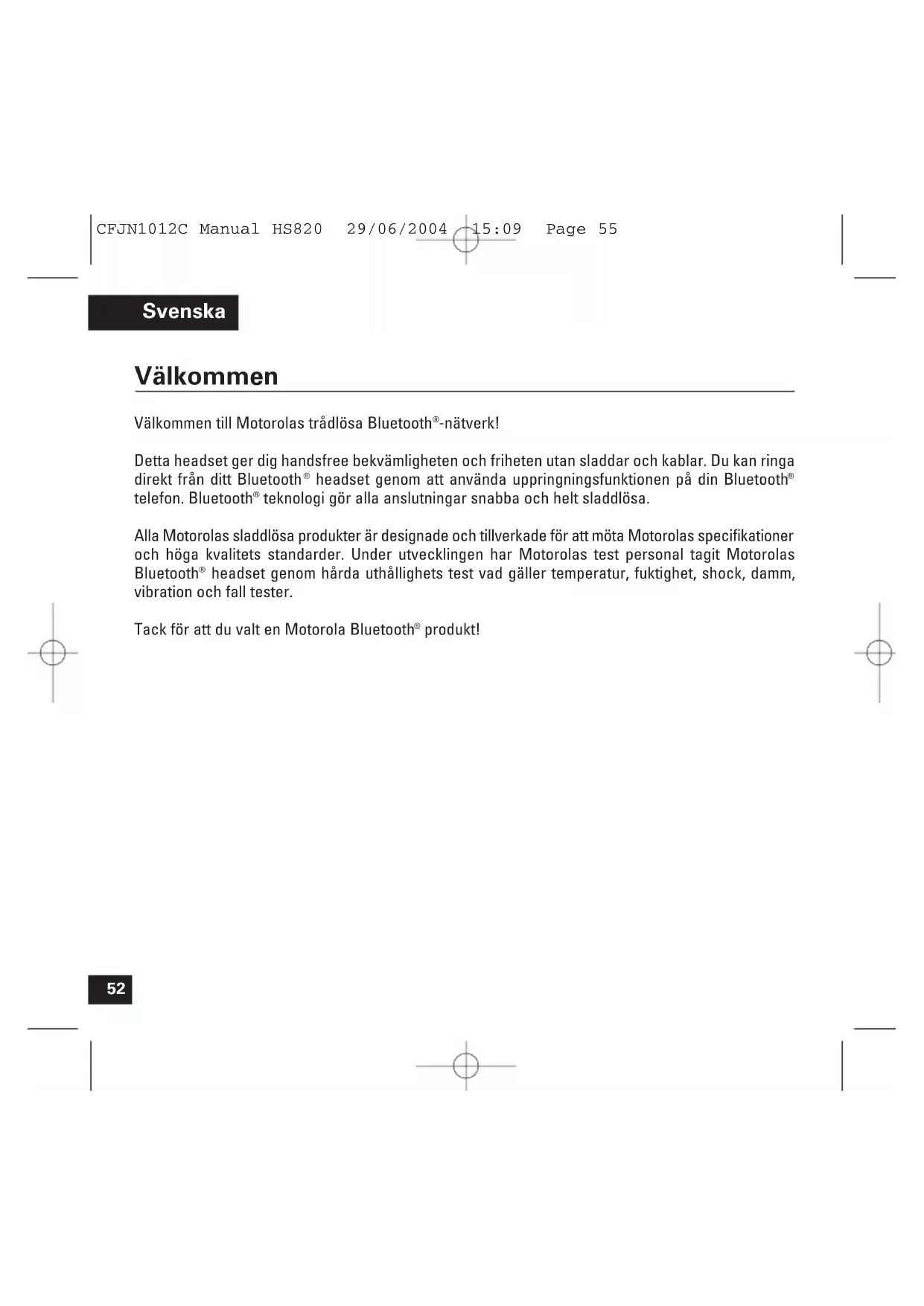 Svenska CFJN1012C Manual HS820 29/06/2004 15:09 Page 5553 Svenska Säkerhet & Generell information Du får inte ändra eller modifiera enheten på något sätt. Ändringar eller modifieringar som inte uttryckligen godkänts av den part som ansvarar för kompatibilitet upphäver användarens rätt att använda utrustningen. Se 47 CFR, stycke 15.21. Enheten följer innehållet i avsnitt 15 i FCC-reglerna och RSS-210 / RSS-139 i Industry Canada. Utrustningen får användas under följande två villkor: (1) Enheten får inte orsaka skadlig störning och (2) enheten måste klara av yttre störningar, inclusive störning som kan orsaka oönskade effekter. Se 47 CFR, stycke 15.19(3). Europeiska unionen (EU) och EFTA Motorola tillkännager att produkten (“HS820”) överensstämmer med de grundläggande kraven och andra relevanta bestämmelser i direktiv 1999/5/EC. Du kan visa produktens DoC (Declaration of Conformity) för direktiv 1999/5/EC (R&TTE-direktivet) på www.motorola.com/rtte. Elektromagnetisk störning och kompatibilitet Nästan alla elektroniska enheter är känsliga för elektromagnetisk störning om de är bristfälligt skärmade, utformade eller på annat sätt konfigurerade förelektromagnetisk kompatibilitet. CFJN1012C Manual HS820 29/06/2004 15:09 Page 56Introduktion Vad är Bluetooth? Bluetooth teknologi tar dig in i en ny dimension vad gäller anslutningsmöjligheter. Bluetooth enheter kommunicerar utan sladdar, genom inbyggda radio sändare som sänder på globalt tillgängliga frekvenser för att försäkra världsomspännande kompatibilitet. Ditt Bluetooth headset kan kommunicera med andra Bluetooth enheter inom ett område på ca 10 meter. Hur kan jag använda mitt sladdlösa headset? Ditt sladdlösa headset med Bluetooth teknologi tillåter dig ansluta till andra Bluetooth utrustade enheter: