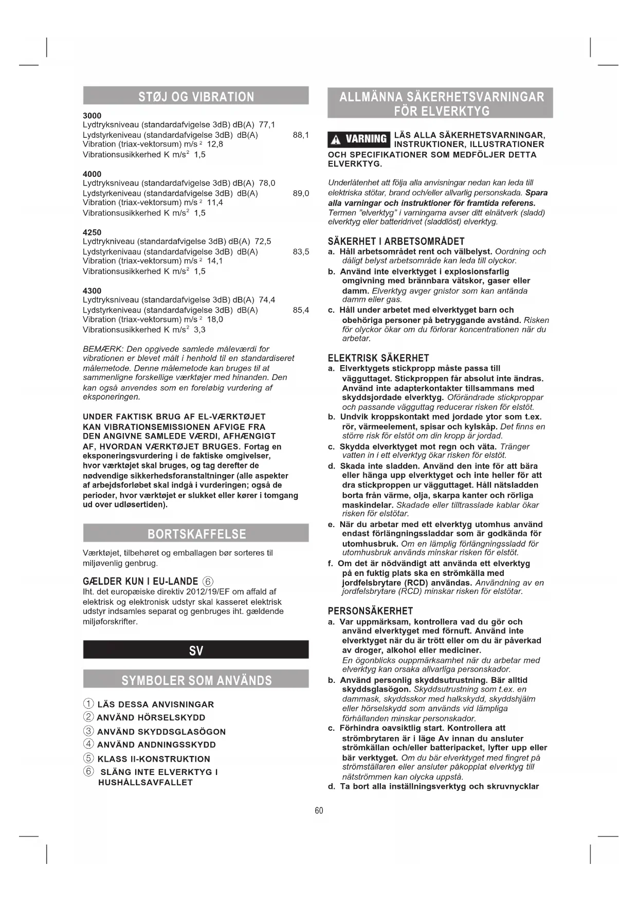 Ljudtrycksnivå (standardavvikelse 3 dB) dB(A) 74,4Ljudeektsnivå (standardavvikelse 3dB) dB(A) 85,4 Vibration (triax vektorsumma) m/s 18,0Vibration osäkerhet K m/s 3,3OBS: Det angivna totala vibrationsvärdet har uppmätts i enlighet med en standardtestmetod och får användas för att jämföra ett verktyg med ett annat. Det kan även användas vid en preliminär exponeringsbedömning.BEROENDE PÅ HUR VERKTYGET ANVÄNDS KAN VIBRATIONERNA VID ANVÄNDNING AV VERKTYGET SKILJA SIG FRÅN DET ANGIVNA TOTALA VIBRATIONSVÄRDET. Gör en uppskattning av exponeringen under verkliga användningsförhållanden och vidta skyddsåtgärder för personalen därefter (ta hänsyn till alla delar i användningsförloppet, som när verktyget stängs av och utöver starttiden, när det går på tomgång). AVFALLSHANTERING Verktyg, tillbehör och förpackning ska källsorteras för återvinning.