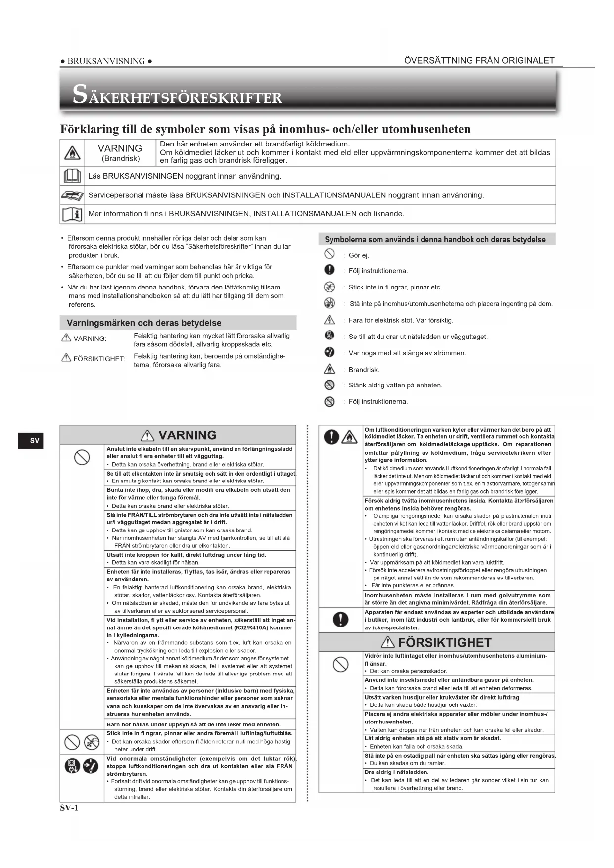 - Eftersom denna produkt innehåller rörliga delar och delar som kan förorsaka elektriska stötar, bör du läsa “Säkerhetsföreskrifter” innan du tar produkten i bruk.• Eftersom de punkter med varningar som behandlas här är viktiga för säkerheten, bör du se till att du följer dem till punkt och pricka.• När du har läst igenom denna handbok, förvara den lättåtkomlig tillsam-mans med installationshandboken så att du lätt har tillgång till dem som referens. Varningsmärken och deras betydelse VARNING:Felaktig hantering kan mycket lätt förorsaka allvarlig fara såsom dödsfall, allvarlig kroppsskada etc. FÖRSIKTIGHET:Felaktig hantering kan, beroende på omständighe-terna, förorsaka allvarlig fara. Symbolerna som används i denna handbok och deras betydelse : Gör ej. : Följ instruktionerna. : Stick inte in fi ngrar, pinnar etc.. Stå inte på inomhus/utomhusenheterna och placera ingenting på dem. : Fara för elektrisk stöt. Var försiktig. : Se till att du drar ut nätsladden ur vägguttaget. : Var noga med att stänga av strömmen. : Brandrisk. : Stänk aldrig vatten på enheten. : Följ instruktionerna.