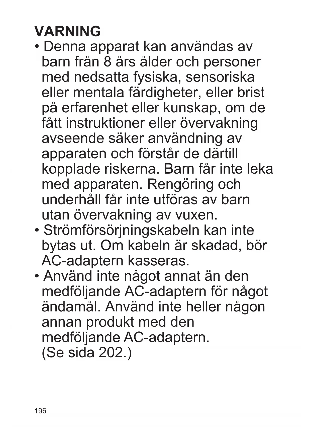 - Denna apparat kan användas av barn från 8 års ålder och personer med nedsatta fysiska, sensoriska eller mentala färdigheter, eller brist på erfarenhet eller kunskap, om de fått instruktioner eller övervakning avseende säker användning av apparaten och förstår de därtill kopplade riskerna. Barn får inte leka medapparaten.Rengöringoch underhåll får inte utföras av barn utan övervakning av vuxen.