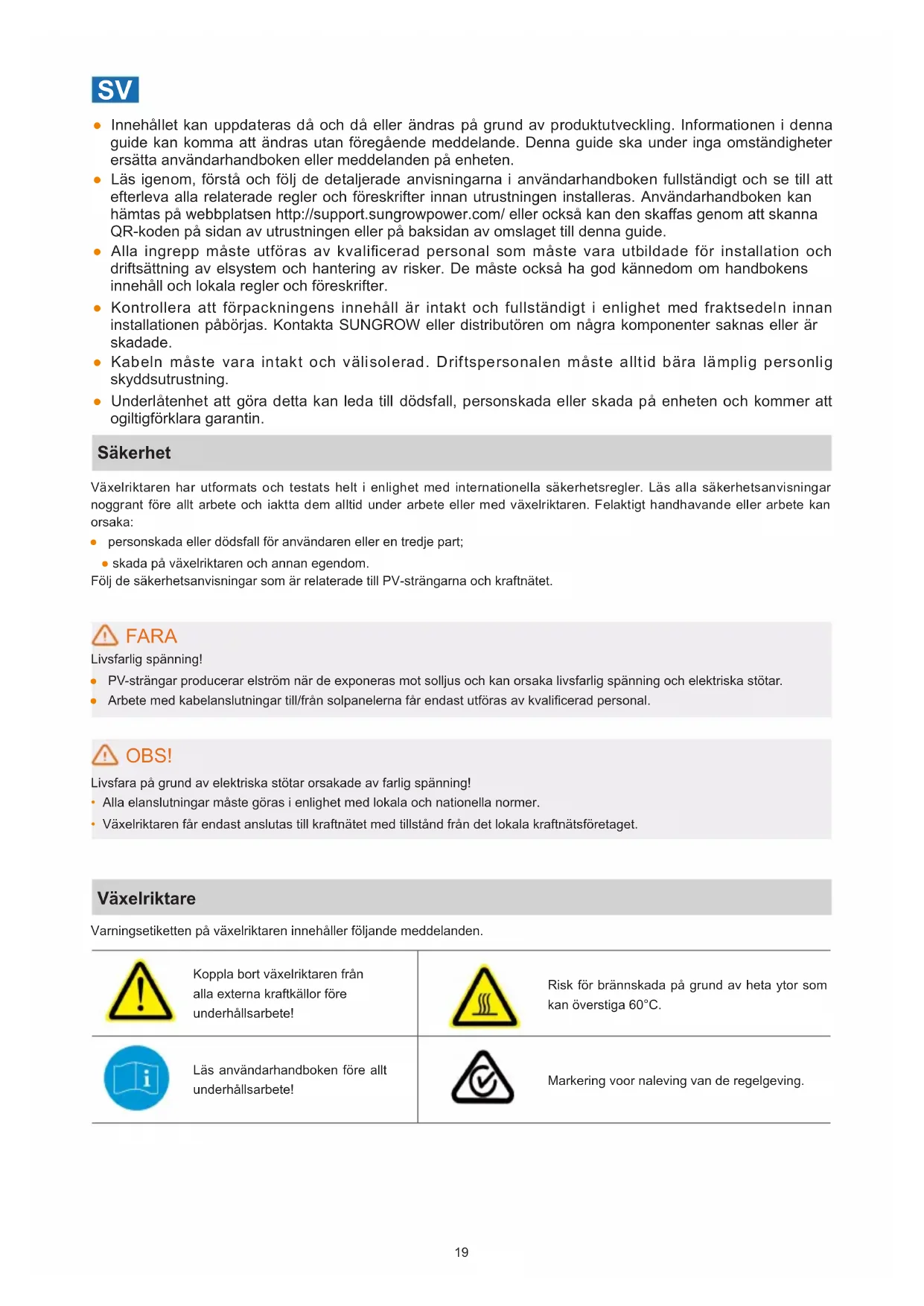 ● Innehållet kan uppdateras då och då eller ändras på grund av produktutveckling. Informationen i denna guide kan komma att ändras utan föregående meddelande. Denna guide ska under inga omständigheter ersätta användarhandboken eller meddelanden på enheten. ● Läs igenom, förstå och följ de detaljerade anvisningarna i användarhandboken fullständigt och se till att efterleva alla relaterade regler och föreskrifter innan utrustningen installeras. Användarhandboken kan hämtas på webbplatsen http://support.sungrowpower.com/ eller också kan den skaas genom att skanna QR-koden på sidan av utrustningen eller på baksidan av omslaget till denna guide. ● Alla ingrepp måste utföras av kvalificerad personal som måste vara utbildade för installation och driftsättning av elsystem och hantering av risker. De måste också ha god kännedom om handbokens innehåll och lokala regler och föreskrifter. ● Kontrollera att förpackningens innehåll är intakt och fullständigt i enlighet med fraktsedeln innan installationen påbörjas. Kontakta SUNGROW eller distributören om några komponenter saknas eller är skadade. ● Kabeln måste vara intakt och välisolerad. Driftspersonalen måste alltid bära lämplig personlig skyddsutrustning. ● Underlåtenhet att göra detta kan leda till dödsfall, personskada eller skada på enheten och kommer att ogiltigförklara garantin. Säkerhet Växelriktaren har utformats och testats helt i enlighet med internationella säkerhetsregler. Läs alla säkerhetsanvisningar noggrant före allt arbete och iaktta dem alltid under arbete eller med växelriktaren. Felaktigt handhavande eller arbete kan orsaka: ● personskada eller dödsfall för användaren eller en tredje part; ● skada på växelriktaren och annan egendom. Följ de säkerhetsanvisningar som är relaterade till PV-strängarna och kraftnätet. FARA Livsfarlig spänning! ● PV-strängar producerar elström när de exponeras mot solljus och kan orsaka livsfarlig spänning och elektriska stötar. ● Arbete med kabelanslutningar till/från solpanelerna får endast utföras av kvalicerad personal. OBS! Livsfara på grund av elektriska stötar orsakade av farlig spänning!