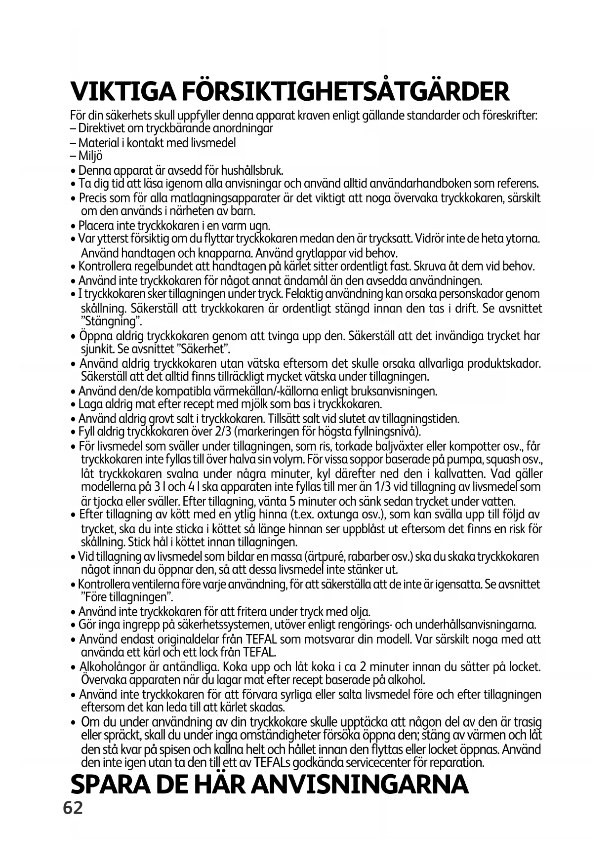 Om du under användning av din tryckkokare skulle upptäcka att någon del av den är trasig eller spräckt, skall du under inga omständigheter försöka öppna den; stäng av värmen och låt den stå kvar på spisen och kallna helt och hållet innan den flyttas eller locket öppnas. Använd den inte igen utan ta den till ett av TEFALs godkända servicecenter för reparation.