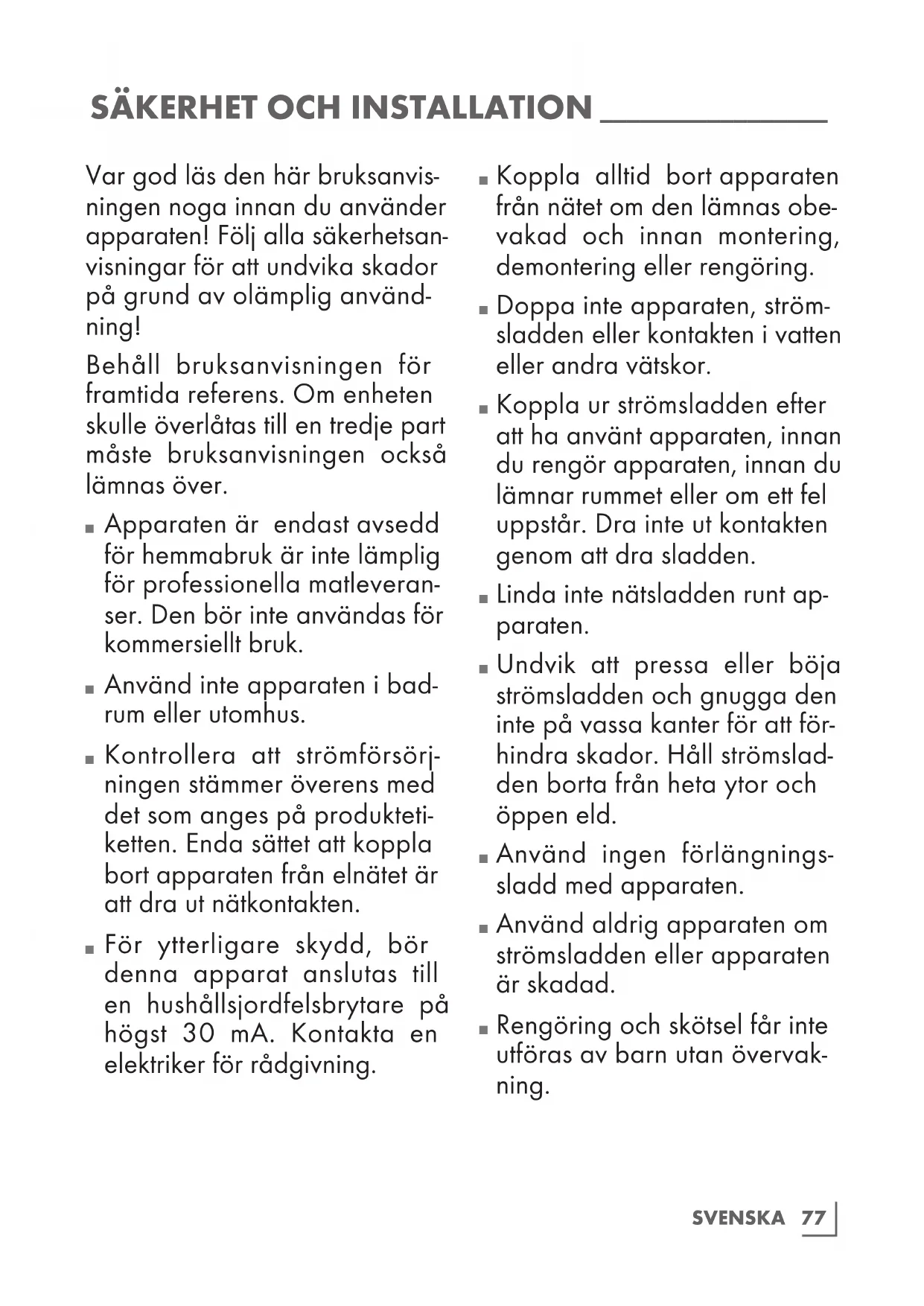 Apparaten är endast avsedd för hemmabruk är inte lämplig för professionella matleveran- ser. Den bör inte användas för kommersiellt bruk.