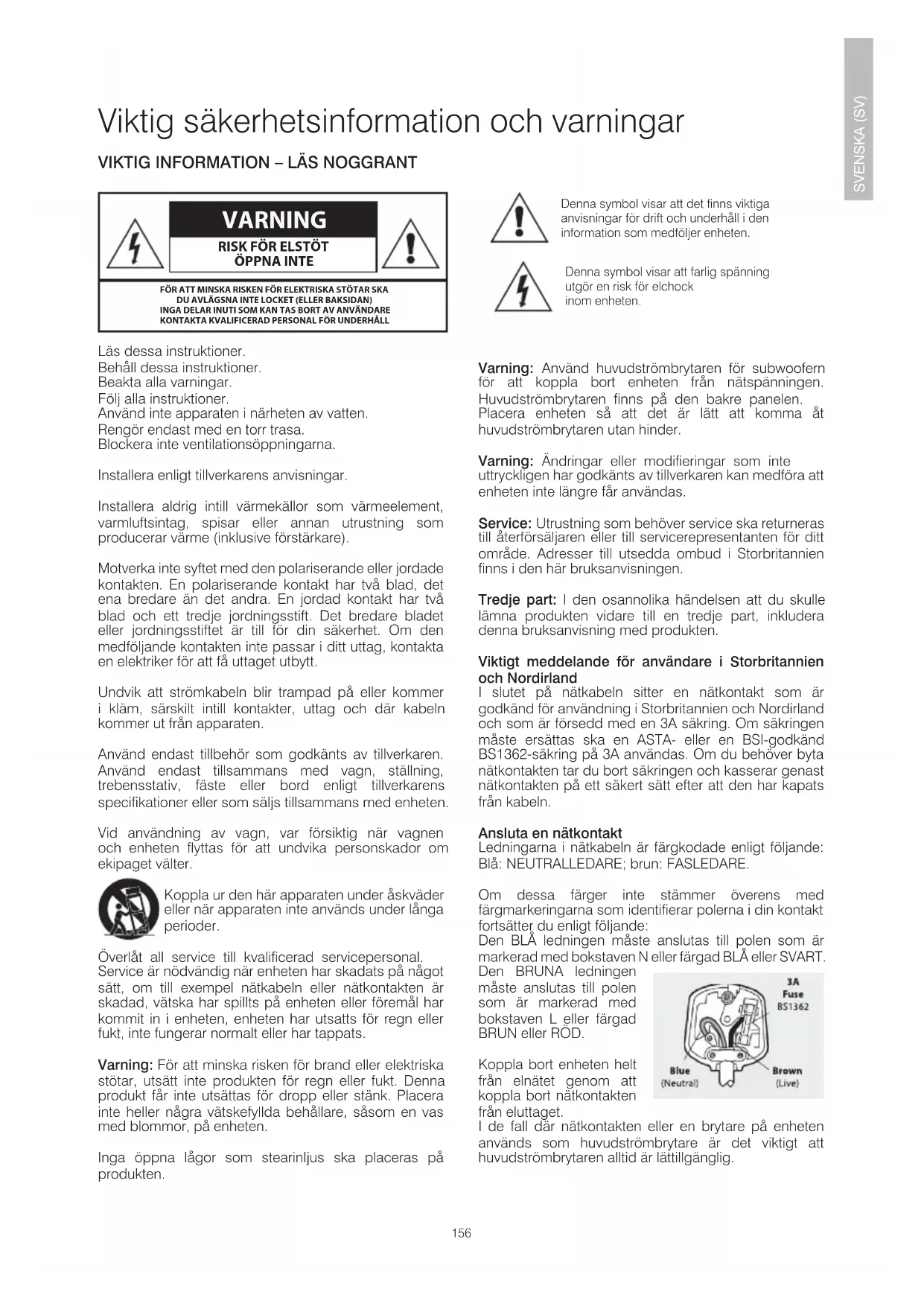 ÖPPNA INTE VARNING FÖR ATT MINSKA RISKEN FÖR ELEKTRISKA STÖTAR SKA DU AVLÄGSNA INTE LOCKET (ELLER BAKSIDAN)INGA DELAR INUTI SOM KAN TAS BORT AV ANVÄNDAREKONTAKTA KVALIFICERAD PERSONAL FÖR UNDERHÅLL Läs dessa instruktioner. Behåll dessa instruktioner. Beakta alla varningar. Följ alla instruktioner. Använd inte apparaten i närheten av vatten. Rengör endast med en torr trasa. Blockera inte ventilationsöppningarna. Installera enligt tillverkarens anvisningar. Installera aldrig intill värmekällor som värmeelement, varmluftsintag, spisar eller annan utrustning som producerar värme (inklusive förstärkare). Motverka inte syftet med den polariserande eller jordade kontakten. En polariserande kontakt har två blad, det ena bredare än det andra. En jordad kontakt har två blad och ett tredje jordningsstift. Det bredare bladet eller jordningsstiftet är till för din säkerhet. Om den medföljande kontakten inte passar i ditt uttag, kontakta en elektriker för att få uttaget utbytt. Undvik att strömkabeln blir trampad på eller kommer i kläm, särskilt intill kontakter, uttag och där kabeln kommer ut från apparaten. Använd endast tillbehör som godkänts av tillverkaren. Använd endast tillsammans med vagn, ställning, trebensstativ, fäste eller bord enligt tillverkarens specikationer eller som säljs tillsammans med enheten. Vid användning av vagn, var försiktig när vagnen och enheten yttas för att undvika personskador om ekipaget välter. Koppla ur den här apparaten under åskväder eller när apparaten inte används under långa perioder. Överlåt all service till kvalicerad servicepersonal. Service är nödvändig när enheten har skadats på något sätt, om till exempel nätkabeln eller nätkontakten är skadad, vätska har spillts på enheten eller föremål har kommit in i enheten, enheten har utsatts för regn eller fukt, inte fungerar normalt eller har tappats. Varning: För att minska risken för brand eller elektriska stötar, utsätt inte produkten för regn eller fukt. Denna produkt får inte utsättas för dropp eller stänk. Placera inte heller några vätskefyllda behållare, såsom en vas med blommor, på enheten. Inga öppna lågor som stearinljus ska placeras på produkten. Varning: Använd huvudströmbrytaren för subwoofern för att koppla bort enheten från nätspänningen. Huvudströmbrytaren nns på den bakre panelen. Placera enheten så att det är lätt att komma åt huvudströmbrytaren utan hinder. Varning: Ändringar eller modieringar som inte uttryckligen har godkänts av tillverkaren kan medföra att enheten inte längre får användas. Service: Utrustning som behöver service ska returneras till återförsäljaren eller till servicerepresentanten för ditt område. Adresser till utsedda ombud i Storbritannien nns i den här bruksanvisningen. Tredje part: I den osannolika händelsen att du skulle lämna produkten vidare till en tredje part, inkludera denna bruksanvisning med produkten. Viktigt meddelande för användare i Storbritannien och Nordirland I slutet på nätkabeln sitter en nätkontakt som är godkänd för användning i Storbritannien och Nordirland och som är försedd med en 3A säkring. Om säkringen måste ersättas ska en ASTA- eller en BSI-godkänd BS1362-säkring på 3A användas. Om du behöver byta nätkontakten tar du bort säkringen och kasserar genast nätkontakten på ett säkert sätt efter att den har kapats från kabeln. Ansluta en nätkontakt Ledningarna i nätkabeln är färgkodade enligt följande: Blå: NEUTRALLEDARE; brun: FASLEDARE. Om dessa färger inte stämmer överens med färgmarkeringarna som identierar polerna i din kontakt fortsätter du enligt följande: Den BLÅ ledningen måste anslutas till polen som är markerad med bokstaven N eller färgad BLÅ eller SVART. Den BRUNA ledningen måste anslutas till polen som är markerad med bokstaven L eller färgad BRUN eller RÖD. Koppla bort enheten helt från elnätet genom att koppla bort nätkontakten från eluttaget. I de fall där nätkontakten eller en brytare på enheten används som huvudströmbrytare är det viktigt att huvudströmbrytaren alltid är lättillgänglig.156 157 Introduktion Tack för att du har köpt en produkt från Q Acoustics. Denna bruksanvisning är avsedd att hjälpa dig med installationen så att du får optimal prestanda från produkten. Läsa instruktionerna, viktiga säkerhetsanvisningar och varningar innan du installerar och använder produkten för att säkerställa en säker och tillfredsställande användning av produkten. Kontrollera produkten noggrant. Meddela återförsäljaren snarast om några delar är skadade eller saknas. Vi hoppas att du gillar upplevelsen av Q Acoustics. SVENSKA (SV)158 159 Fäst låsmuttrarna på varje spike och skruva fast alla fyra spikes i subwooferns fötter. Om du har ett trä- eller stengolv sätter du ett skydd på alla spikes innan du ställer högtalaren upprätt. När högtalaren står upprätt justerar du alla spikes tills högtalaren står jämnt och stabilt. SVENSKA (SV) Förberedelser Lyft högtalarna från kartongen genom att hålla i kabinetten. Rör inte elementen och använd inte skyddspåsarna för att lyfta dem. Q B12- serien är tunga. Be någon om hjälp med att lyfta dem vid behov. Spikes är vassa. Var försiktig! Placera aldrig en högtalare med spikes där den kan orsaka skador! Flytta alltid på högtalarna genom att lyfta dem, dra dem aldrig över golvet!158 159 Positionering SVENSKA (SV) Basfrekvenser är huvudsakligen rundstrålande. Detta innebär att det går att placera subwoofern i stort sett var som helst, men stereobilden blir bättre om subwoofern placeras i samma höjd som de främre högtalarna och så centralt som möjligt i förhållande till lyssningspositionen. Detta är kanske inte möjligt i ett erkanalsystem. Om subwoofern placeras för nära en vägg förstärks basen. Den kan bli dånande och oklar i vissa placeringar. Subwoofern bör plac