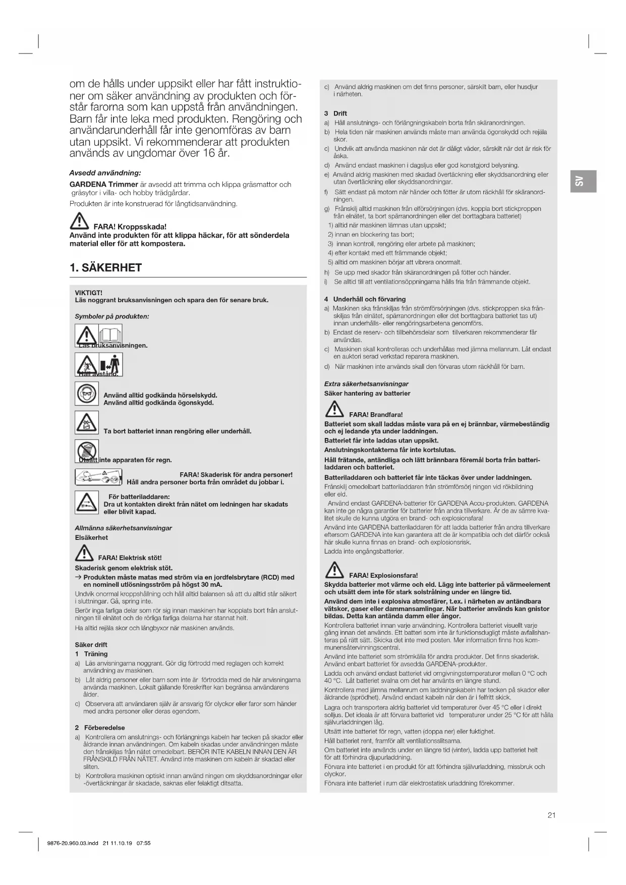 om de hålls under uppsikt eller har fått instruktio- ner om säker användning av produkten och för- står farorna som kan uppstå från användningen. Barn får inte leka med produkten. Rengöring och användarunderhåll får inte genomföras av barn utan uppsikt. Vi rekommenderar att produkten används av ungdomar över 16 år. Avsedd användning: GARDENA Trimmer är avsedd att trimma och klippa gräsmattor och gräsytor i villa- och hobby trädgårdar. Produkten är inte konstruerad för långtidsanvändning.