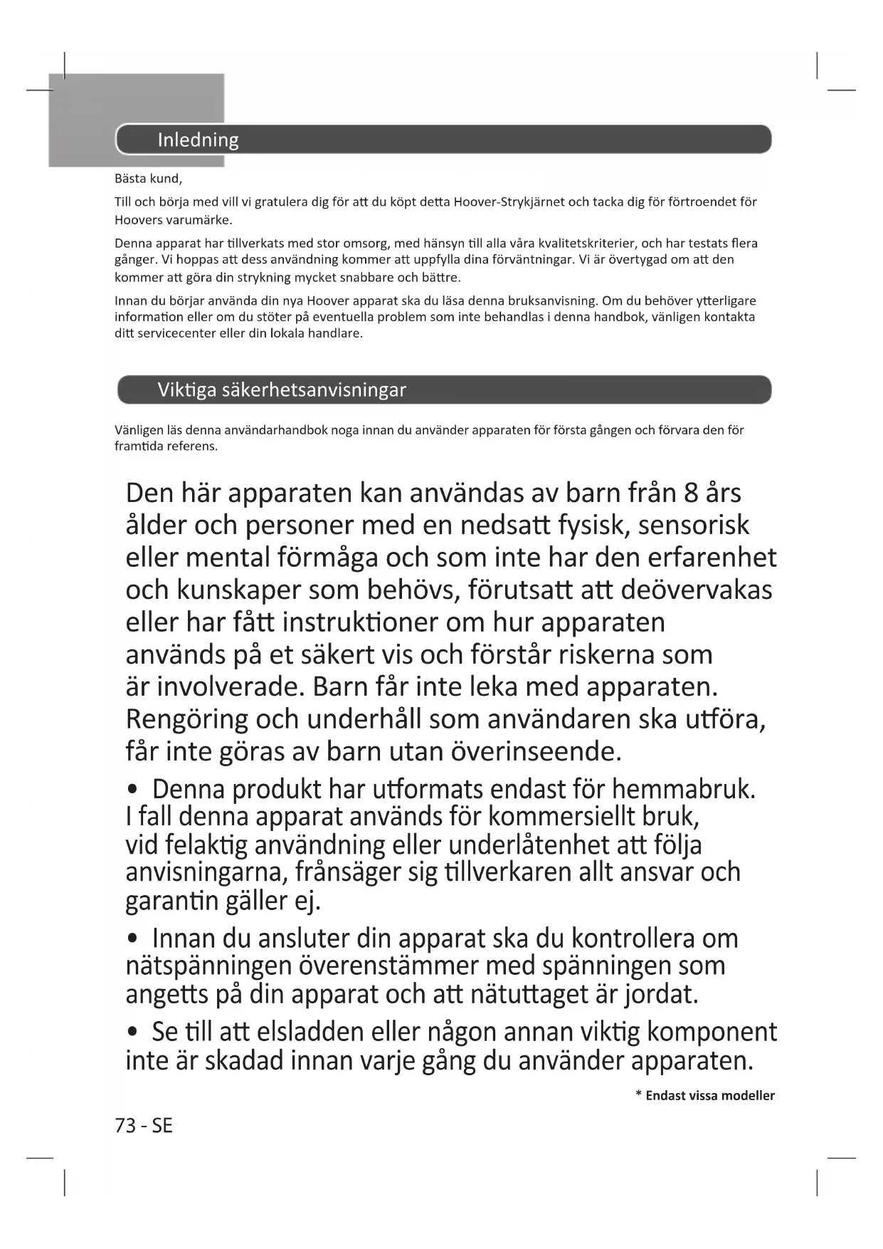 - Endast vissa modeller Inledning Bästa kund, Till och börja med vill vi gratulera dig för a du köpt dea Hoover-Strykjärnet och tacka dig för förtroendet för Hoovers varumärke. Denna apparat har llverkats med stor omsorg, med hänsyn ll alla våra kvalitetskriterier, och har testats era gånger. Vi hoppas a dess användning kommer a uppfylla dina förväntningar. Vi är övertygad om a den kommer a göra din strykning mycket snabbare och bäre. Innan du börjar använda din nya Hoover apparat ska du läsa denna bruksanvisning. Om du behöver yerligare informaon eller om du stöter på eventuella problem som inte behandlas i denna handbok, vänligen kontakta di servicecenter eller din lokala handlare. Vikga säkerhetsanvisningar Vänligen läs denna användarhandbok noga innan du använder apparaten för första gången och förvara den för framda referens. Den här apparaten kan användas av barn från 8 års ålder och personer med en nedsa fysisk, sensorisk eller mental förmåga och som inte har den erfarenhet och kunskaper som behövs, förutsa a deövervakas eller har få instrukoner om hur apparaten används på et säkert vis och förstår riskerna som är involverade. Barn får inte leka med apparaten. Rengöring och underhåll som användaren ska uöra, får inte göras av barn utan överinseende.