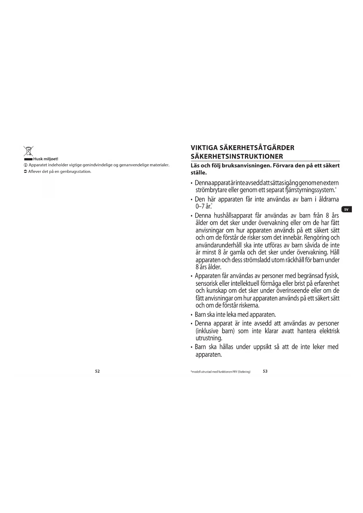 - Denna hushållsapparat får användas av barn från 8 års ålder om det sker under övervakning eller om de har fått anvisningar om hur apparaten används på ett säkert sätt och om de förstår de risker som det innebär. Rengöring och användarunderhåll ska inte utföras av barn såvida de inte är minst 8 år gamla och det sker under övervakning. Håll apparaten och dess strömsladd utom räckhåll för barn under 8 års ålder.