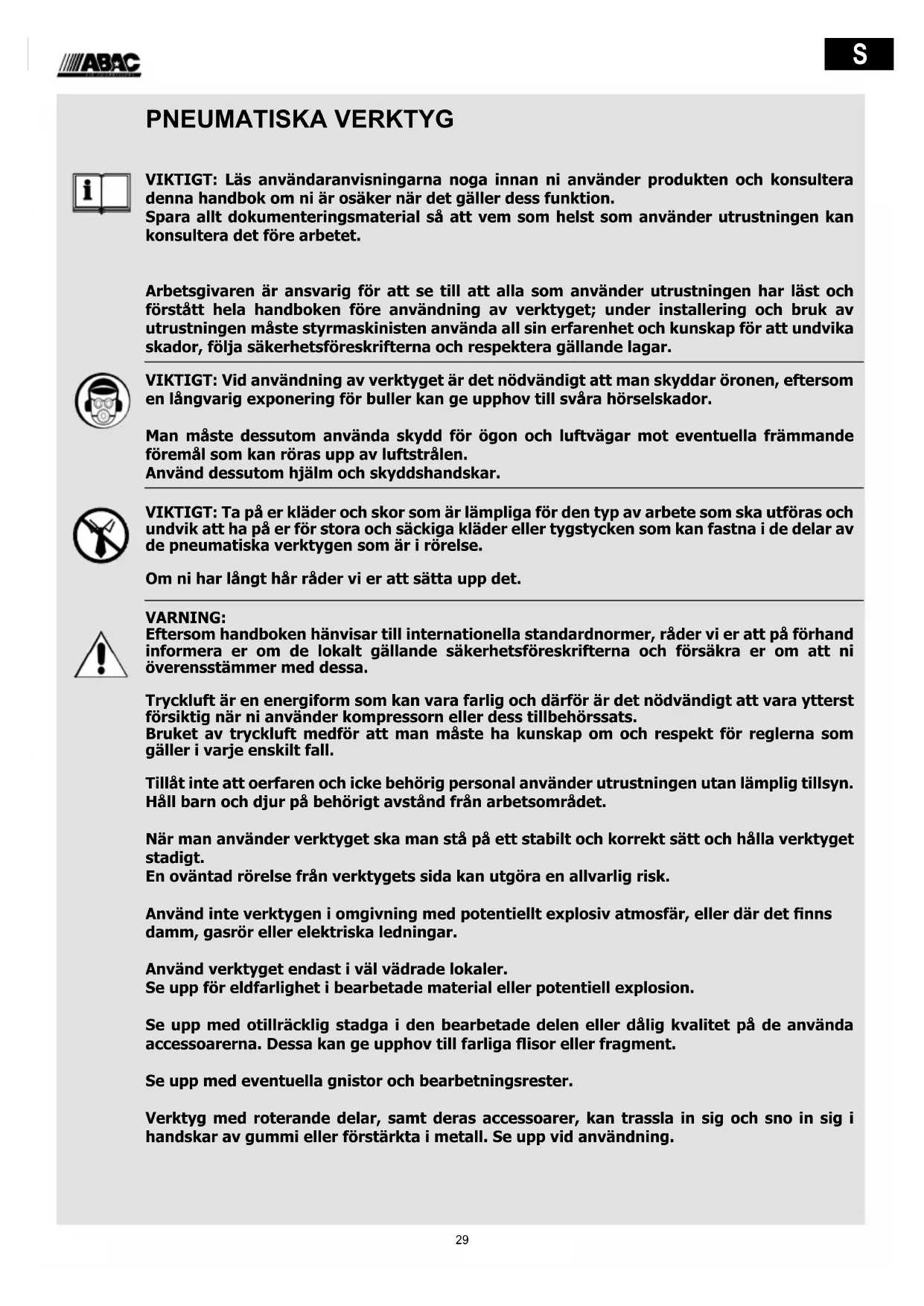 PNEUMATISKA VERKTYG VIKTIGT: Läs användaranvisningarna noga innan ni använder produkten och konsultera denna handbok om ni är osäker när det gäller dess funktion. Spara allt dokumenteringsmaterial så att vem som helst som använder utrustningen kan konsultera det före arbetet. Arbetsgivaren är ansvarig för att se till att alla som använder utrustningen har läst och förstått hela handboken före användning av verktyget; under installering och bruk av utrustningen måste styrmaskinisten använda all sin erfarenhet och kunskap för att undvika skador, följa säkerhetsföreskrifterna och respektera gällande lagar. VIKTIGT: Vid användning av verktyget är det nödvändigt att man skyddar öronen, eftersom en långvarig exponering för buller kan ge upphov till svåra hörselskador. Man måste dessutom använda skydd för ögon och luftvägar mot eventuella främmande föremål som kan röras upp av luftstrålen. Använd dessutom hjälm och skyddshandskar. VIKTIGT: Ta på er kläder och skor som är lämpliga för den typ av arbete som ska utföras och undvik att ha på er för stora och säckiga kläder eller tygstycken som kan fastna i de delar av de pneumatiska verktygen som är i rörelse. Om ni har långt hår råder vi er att sätta upp det. VARNING: Eftersom handboken hänvisar till internationella standardnormer, råder vi er att på förhand informera er om de lokalt gällande säkerhetsföreskrifterna och försäkra er om att ni överensstämmer med dessa. Tryckluft är en energiform som kan vara farlig och därför är det nödvändigt att vara ytterst försiktig när ni använder kompressorn eller dess tillbehörssats. Bruket av tryckluft medför att man måste ha kunskap om och respekt för reglerna som gäller i varje enskilt fall. Tillåt inte att oerfaren och icke behörig personal använder utrustningen utan lämplig tillsyn. Håll barn och djur på behörigt avstånd från arbetsområdet. När man använder verktyget ska man stå på ett stabilt och korrekt sätt och hålla verktyget stadigt. En oväntad rörelse från verktygets sida kan utgöra en allvarlig risk. Använd inte verktygen i omgivning med potentiellt explosiv atmosfär, eller där det nns damm, gasrör eller elektriska ledningar. Använd verktyget endast i väl vädrade lokaler. Se upp för eldfarlighet i bearbetade material eller potentiell explosion. Se upp med otillräcklig stadga i den bearbetade delen eller dålig kvalitet på de använda accessoarerna. Dessa kan ge upphov till farliga isor eller fragment. Se upp med eventuella gnistor och bearbetningsrester. Verktyg med roterande delar, samt deras accessoarer, kan trassla in sig och sno in sig i handskar av gummi eller förstärkta i metall. Se upp vid användning.30