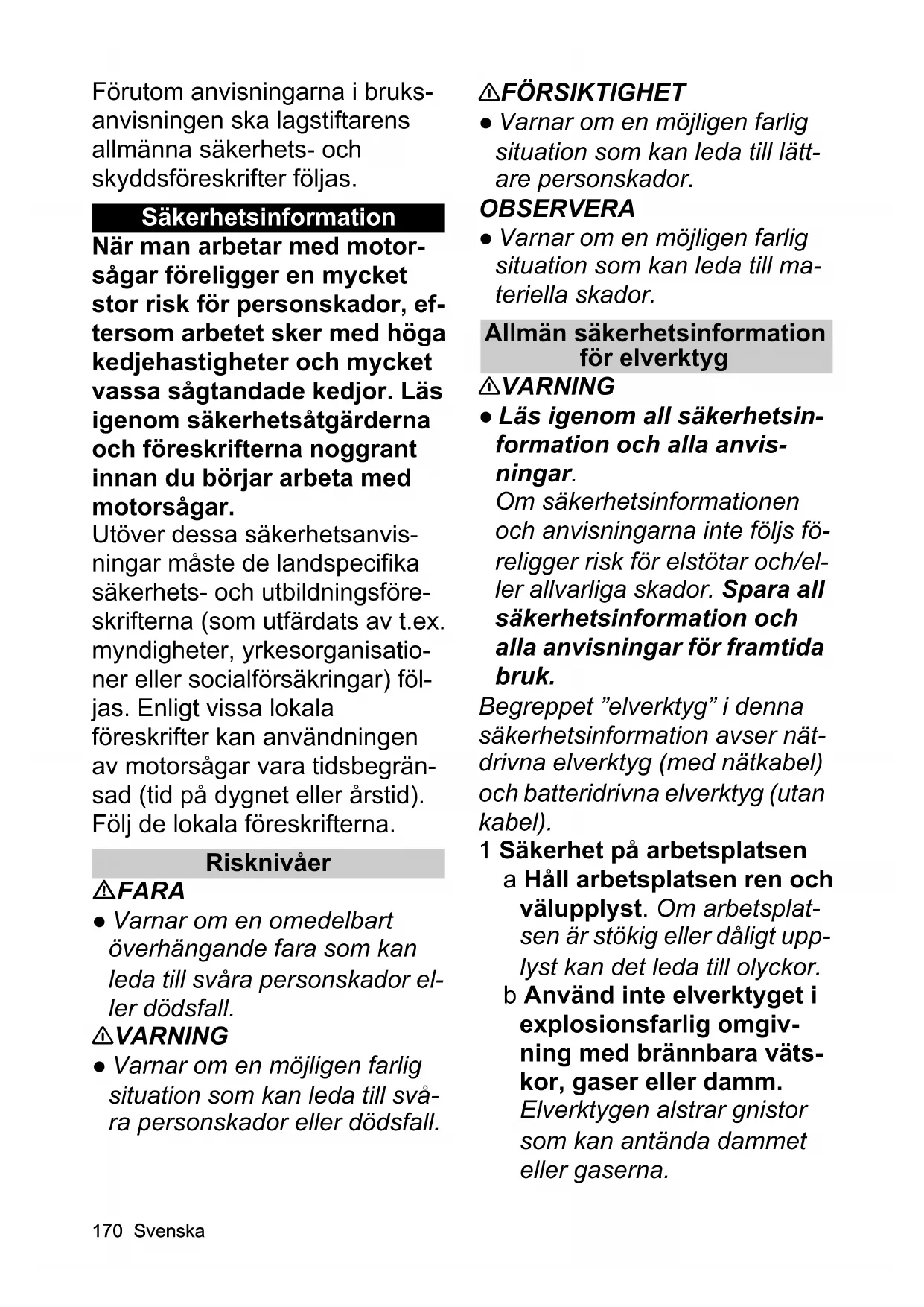 • EU-försäkran om överensstämmelse Chairman of the Board of ManagementDirector Regulatory Affairs & Certification H. Jenner S. Reiser170 Svenska Förutom anvisningarna i bruks- anvisningen ska lagstiftarens allmänna säkerhets- och skyddsföreskrifter följas. Säkerhetsinformation När man arbetar med motor- sågar föreligger en mycket stor risk för personskador, ef- tersom arbetet sker med höga kedjehastigheter och mycket vassa sågtandade kedjor. Läs igenom säkerhetsåtgärderna och föreskrifterna noggrant innan du börjar arbeta med motorsågar. Utöver dessa säkerhetsanvis- ningar måste de landspecifika säkerhets- och utbildningsföre- skrifterna (som utfärdats av t.ex. myndigheter, yrkesorganisatio- ner eller socialförsäkringar) föl- jas. Enligt vissa lokala föreskrifter kan användningen av motorsågar vara tidsbegrän- sad (tid på dygnet eller årstid). Följ de lokala föreskrifterna. Risknivåer FARA ● Varnar om en omedelbart överhängande fara som kan leda till svåra personskador el- ler dödsfall. 몇 VARNING ● Varnar om en möjligen farlig situation som kan leda till svå- ra personskador eller dödsfall. 몇 FÖRSIKTIGHET ● Varnar om en möjligen farlig situation som kan leda till lätt- are personskador. OBSERVERA ● Varnar om en möjligen farlig situation som kan leda till ma- teriella skador. Allmän säkerhetsinformation för elverktyg 몇 VARNING ● Läs igenom all säkerhetsin- formation och alla anvis- ningar. Om säkerhetsinformationen och anvisningarna inte följs fö- religger risk för elstötar och/el- ler allvarliga skador. Spara all säkerhetsinformation och alla anvisningar för framtida bruk. Begreppet ”elverktyg” i denna säkerhetsinformation avser nät- drivna elverktyg (med nätkabel) och batteridrivna elverktyg (utan kabel). 1 Säkerhet på arbetsplatsen a Håll arbetsplatsen ren och välupplyst. Om arbetsplat- sen är stökig eller dåligt upp- lyst kan det leda till olyckor. b Använd inte elverktyget i explosionsfarlig omgiv- ning med brännbara väts- kor, gaser eller damm. Elverktygen alstrar gnistor som kan antända dammet eller gaserna.Svenska 171 c Håll barn och obehöriga personer på betryggande avstånd när du arbetar med elverktyget. Om du distraheras kan du förlora kontrollen över elverktyget. 2 Elsäkerhet a Elverktygets stickkontakt måste passa till väggutta- get. Stickkontakten får ab- solut inte förändras. Använd inte adapterkon- takter tillsammans med skyddsjordade elverktyg. Oförändrade stickkontakter och passande vägguttag minskar risken för elstötar. b Undvik kroppskontakt med jordade ytor som t.ex. rör, värmeelement, spisar och kylskåp. Risken för el- stötar är större om din kropp är jordad. c Skydda elverktyget mot regn och fukt. Tränger vat- ten in i ett elverktyg ökar ris- ken för elstötar. d Missbruka inte nätsladden och använd den inte för att bära eller hänga upp el- verktyget och inte heller för att dra ut stickkontak- ten ur vägguttaget. Håll nätsladden på avstånd från värme, olja, vassa kanter och rörliga maskin- delar. Skadade eller tilltrass- lade ledningar ökar risken för elstötar. e När du arbetar med ett el- verktyg utomhus får en- dast förlängningskablar som är avsedda för utom- husbruk användas. Ge- nom att använda en lämplig förlängningskabel för utom- husbruk minskar du risken för elstötar. f Om det är alldeles nödvän- digt att använda verktyget i en fuktig miljö måste du använda en jordfelsbryta- re. Jordfelsbrytare minskar risken för elstötar. 3 Personsäkerhet a Var uppmärksam, tänk på vad du gör och använd sunt förnuft när du arbetar med ett elverktyg. Använd aldrig elverktyg om du är trött eller är påverkad av droger, alkohol eller medi- ciner. Tillfällig ouppmärk- samhet medan elverktyget används kan vålla allvarliga skador. b Bär alltid personlig skyddsutrustning och skyddsglasögon. Genom att använda personlig skyddsutrustning som t.ex. dammskyddsmask, halkfria säkerhetsskor, skyddshjälm eller hörselskydd, beroende på vilket elverktyg du använ- der och till vad, minskar du risken för kroppsskada.172 Svenska c Undvik oavsiktlig igångsättning. Se till att el- verktyget är frånkopplat innan du ansluter det till strömförsörjningen och/ eller batteriet, tar upp det eller bär det. Om du bär el- verktyget med fingret på strömbrytaren eller ansluter ett tillkopplat verktyg till strömförsörjningen kan en olycka inträffa. d Ta bort alla inställnings- verktyg och skruvnycklar innan du kopplar in elverk- tyget. Ett verktyg eller en nyckel i en roterande kom- ponent kan leda till person- skador. e Undvik onormal kropps- hållning. Se till att du står stadigt och håller balan- sen. På så sätt kan du lätt- are kontrollera elverktyget i oväntade situationer. f Bär lämplig klädsel. Bär inga löst sittande kläder eller smycken. Håll kläder och handskar på avstånd från rörliga delar. Löst sit- tande kläder, handskar, smycken eller långt hår kan slitas fast av rörliga delar. g När du använder elverktyg med anordningar för upp- sugning och uppsamling av damm måste du kont- rollera att dessa anord- ningar är rätt monterade och används korrekt. An- vänd dammuppsugning för att minska risken för faror som orsakas av damm. 4 Användning och hantering av elverktyg a Överbelasta inte verkty- get. Använd elverktyg som är avsedda för det aktuella arbetet. Med ett lämpligt el- verktyg kan du arbeta bättre och säkrare inom angivet ef- fektområde. b Använd aldrig elverktyget om strömbrytaren är de- fekt. Ett elverktyg som inte kan kopplas in eller ur är far- ligt och måste repareras. c Dra ut stickkontakten ur uttaget och/eller ta ut bat- teriet innan du gör inställ- ningar på verktyget, byter tillbehör eller lägger ifrån dig verktyget. Denna skyddsåtgärd förhindrar att du eller någon annan råkar sätta igång elverktyget av misstag.