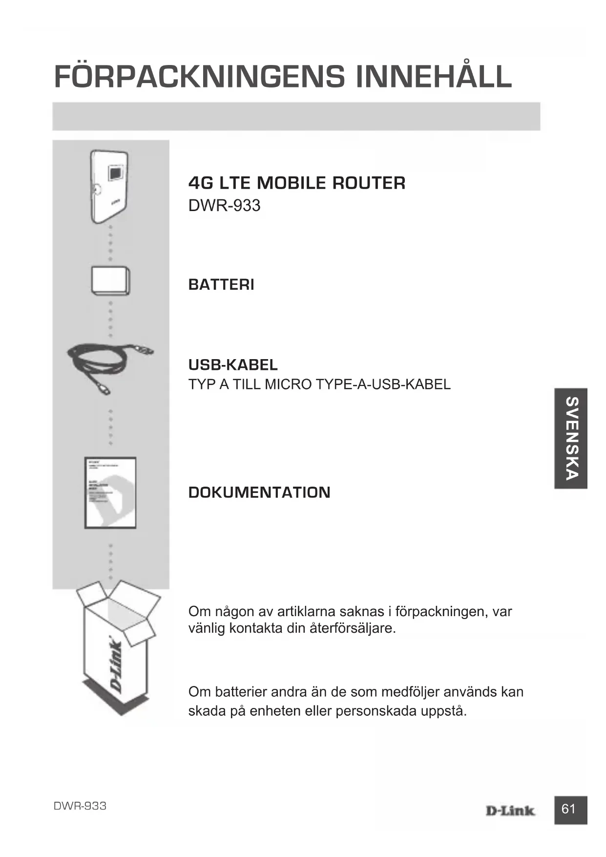 Om någon av artiklarna saknas i förpackningen, var vänlig kontakta din återförsäljare. Om batterier andra än de som medföljer används kan skada på enheten eller personskada uppstå. DOKuMENTATION62 DWR-933 SVENSKA PRODuKTINSTALLATION SNAbbiNSTALLATioN Steg 6: Anslut USB-kabeln och koppla in den till USB-porten på en strömadapter eller en persondator för att ladda batteriet. Steg 1: Lyft av den bakre luckan med hjälp av skåran i nederkanten. Steg 5: Sätt tillbaka batteriet och batteriluckan. Steg 3: Skjut in micro-SIM-kort-fästet åt vänster, tills det hörs ett klickljud, för att låsa upp det. Lyft det sedan för att öppna. Placera ditt micro-SIM-kort i facket med skåran i läget överst till höger och stäng sedan fästet och skjut det till höger tills det hörs ett klickljud när den låser på plats. Steg 2: Ta bort batteriet med hjälp av skåran längs den övre kanten på batterifacket Steg 4: Om du vill sätta i ett microSD-kort så trycker du nedåt på microSD-kortets fäste tills det hörs ett klickljud. Lyft det sedan för att öppna. Sätt in microSD-kortet i fördjupningen och stäng sedan fästet och skjut det uppåt tills det hörs ett klickljud när den låser på plats. SIM SD63 DWR-933 SVENSKA Steg 3: Använd en webbläsare för att gå till 192.168.0.1 för att logga in på kongurationsgränssnittet. Förinställt användarnamn är admin, och lösenordet ska lämnas tomt. Steg 2: Anslut din persondator till något av DWR-933:s trådlösa nätverk. Inställningarna är som standard: 2,4 GHz SSID: dlink_DWR-933-xxxx 5 GHz SSID: dlink_DWR-933-5G-xxxx Lösenord: xxxxxxxxxx (xxxx är en kod på 4 tecken som är unik för din DWR-933) Steg 1: Slå på DWR-933 genom att trycka på och hålla ned strömknappen tills meddelandet ”Välkommen” visas på displayen. KONFIGuRATION ANSLuTA DiN ENHET - ViA TRÅDLÖS uPPKoPPLiNG Steg 4: Använd skärmmenyerna för att kongurera enheten.64 DWR-933 SVENSKA ANSLuTA DiN ENHET - ViA uSb-KAbEL Steg 2: Anslut DWR-933 till din dator med USB-kabeln. På moderna enheter bör enheten installeras automatiskt. Steg 3: Använd en webbläsare för att gå till 192.168.0.1 för att logga in på kongurationsgränssnittet. Förinställt användarnamn är admin, och lösenordet ska lämnas tomt. Steg 1: Slå på DWR-933 genom att trycka på och hålla ned strömknappen tills meddelandet ”Välkommen” visas på displayen. Steg 4: Använd skärmmenyerna för att kongurera enheten.65 DWR-933 SVENSKA TEKNiSK SuPPoRT eu.dlink.com/support FELSÖKNING PRobLEM MED iNSTÄLLNiNG oCH KoNFiGuRATioN