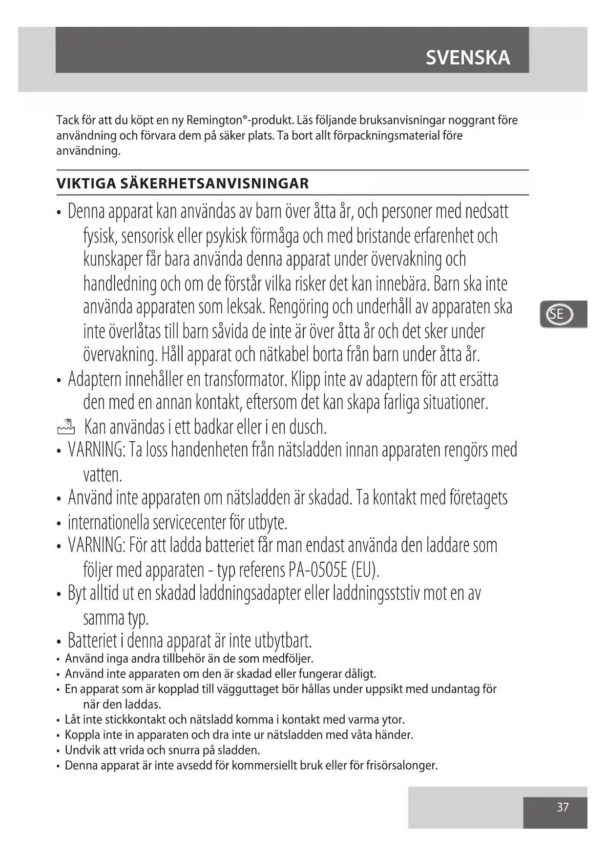 För att undvika miljö- och hälsoproblem pga. farliga ämnen får man inte kassera apparater eller laddningsbara och icke-laddningsbara batterier märkta med någon av dessa symboler i osorterat kommunalt avfall. Elektriska och elektroniska produkter och, där tillämpligt, laddningsbara och icke-laddningsbara batterier ska alltid kasseras vid en lämplig, ociell återvinnings-/uppsamlingsstation.41 NORSK Takk for at du kjøper et nytt Remington®-produkt. Vennligst les denne bruksanvisningen godt og legg den på et trygt sted. Fjern all emballasje før bruk. VIKTIG SIKKERHETSTILTAK