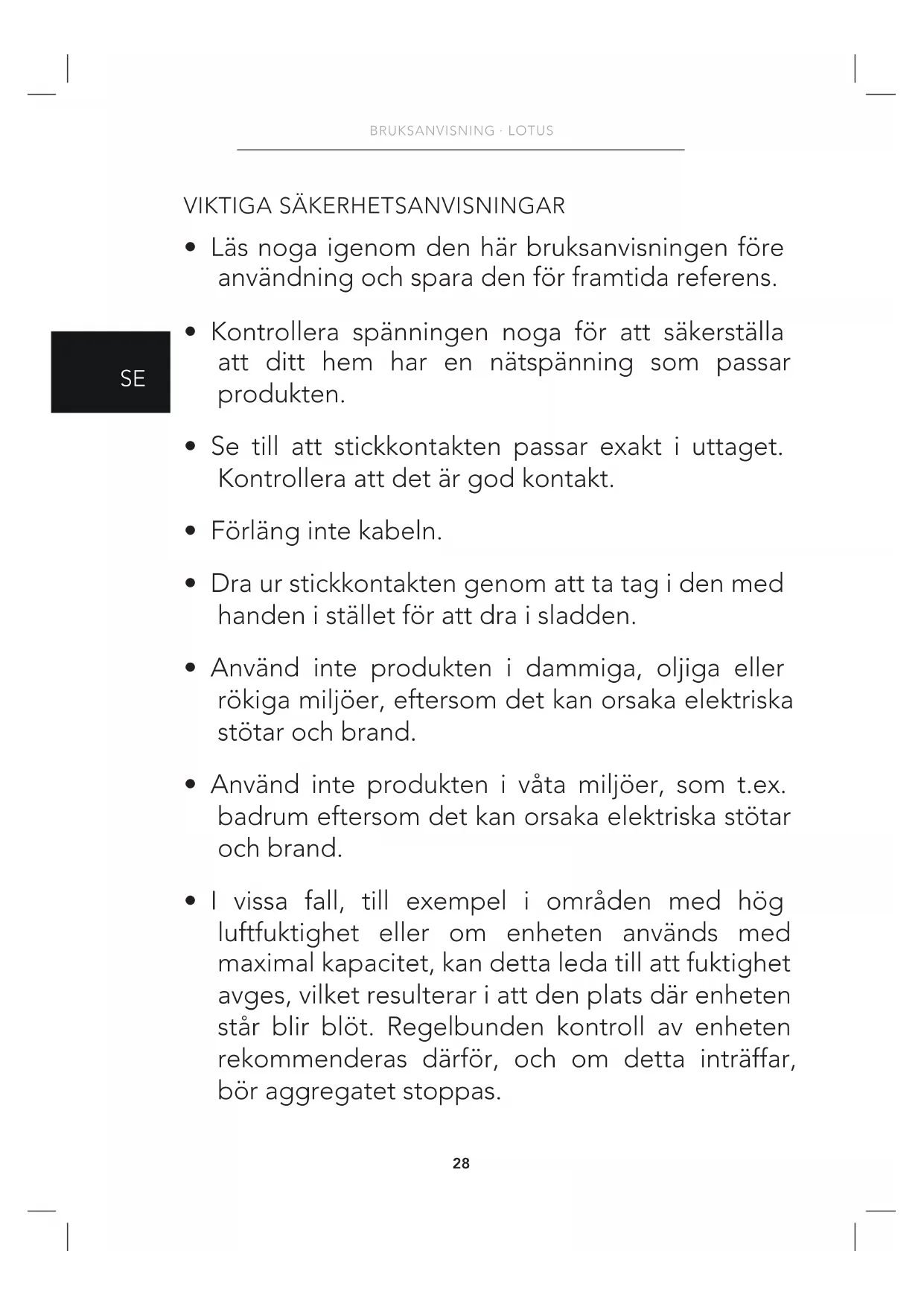 BRUKSANVISNING · LOTUS GARANTI Wilfa ger en garanti på fem (5) år på denna produkt från och med inköpsdatum. Garantin täcker tillverkningsfel eller defekter som uppstår under garantiperioden. Ditt inköpskvitto fungerar som bevis gentemot återförsäljaren om du åberopar garanti. Garantin gäller endast produkter som köps och används för privat bruk, för normala hushållsändamål. Garantin gäller inte om produkten används för kommersiella ändamål. Garantin gäller inte om produkten används felaktigt eller oaktsamt, om du underlåter att följa Wilfas anvisningar, om produkten har modierats eller om reparation har utförts av en icke auktoriserad person/ verkstad. Garantin omfattar vidare inte fel som uppstår till följd av normalt slitage, felaktig användning, bristande underhåll eller felaktig elektrisk spänning eller: