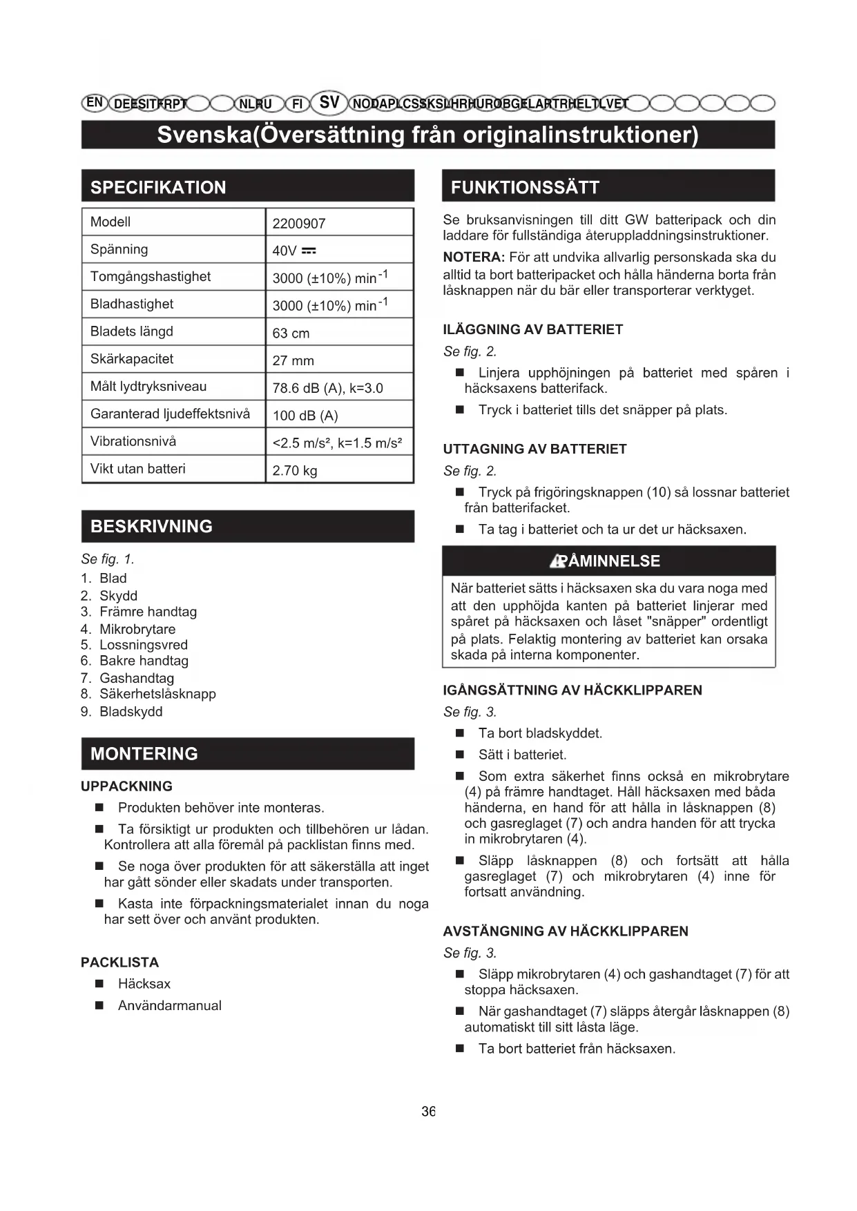 MONTERING UPPACKNING Produkten behöver inte monteras. Ta försiktigt ur produkten och tillbehören ur lådan. Kontrollera att alla föremål på packlistan finns med. Se noga över produkten för att säkerställa att inget har gått sönder eller skadats under transporten. Kasta inte förpackningsmaterialet innan du noga har sett över och använt produkten. PACKLISTA Häcksax Användarmanual FUNKTIONSSÄTT Se bruksanvisningen till ditt GW batteripack och din laddare för fullständiga återuppladdningsinstruktioner. NOTERA: För att undvika allvarlig personskada ska du alltid ta bort batteripacket och hålla händerna borta från låsknappen när du bär eller transporterar verktyget.