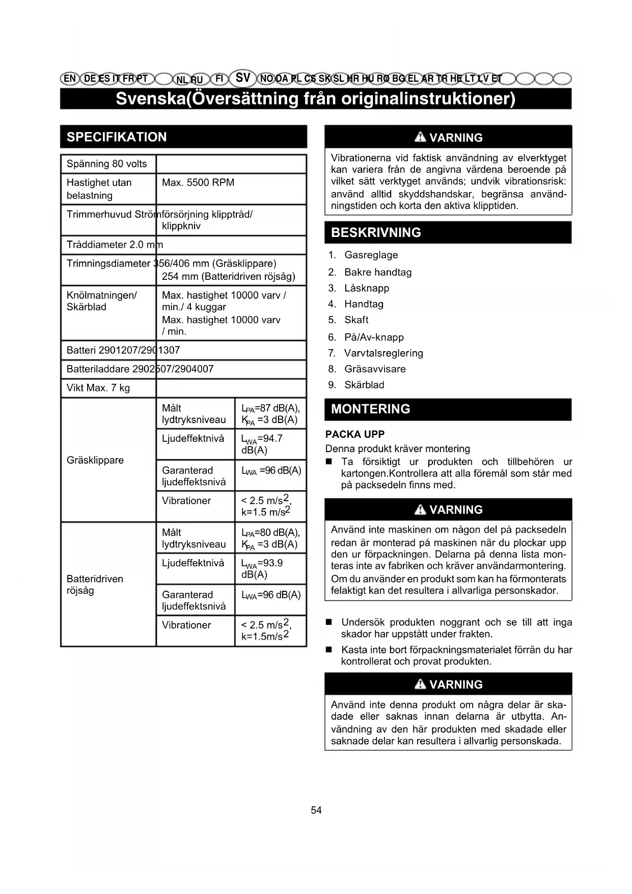 SPECIFIKATION Spänning 80 volts Hastighet utan belastning Max. 5500 RPM Trimmerhuvud Strömförsörjning klipptråd/ klippkniv Tråddiameter 2.0 mm Trimningsdiameter 356/406 mm (Gräsklippare) 254 mm (Batteridriven röjsåg) Knölmatningen/ Skärblad Max. hastighet 10000 varv / min./ 4 kuggar Max. hastighet 10000 varv / min. Batteri 2901207/2901307 Batteriladdare 2902507/2904007 Vikt Max. 7 kg Gräsklippare Målt lydtryksniveau
