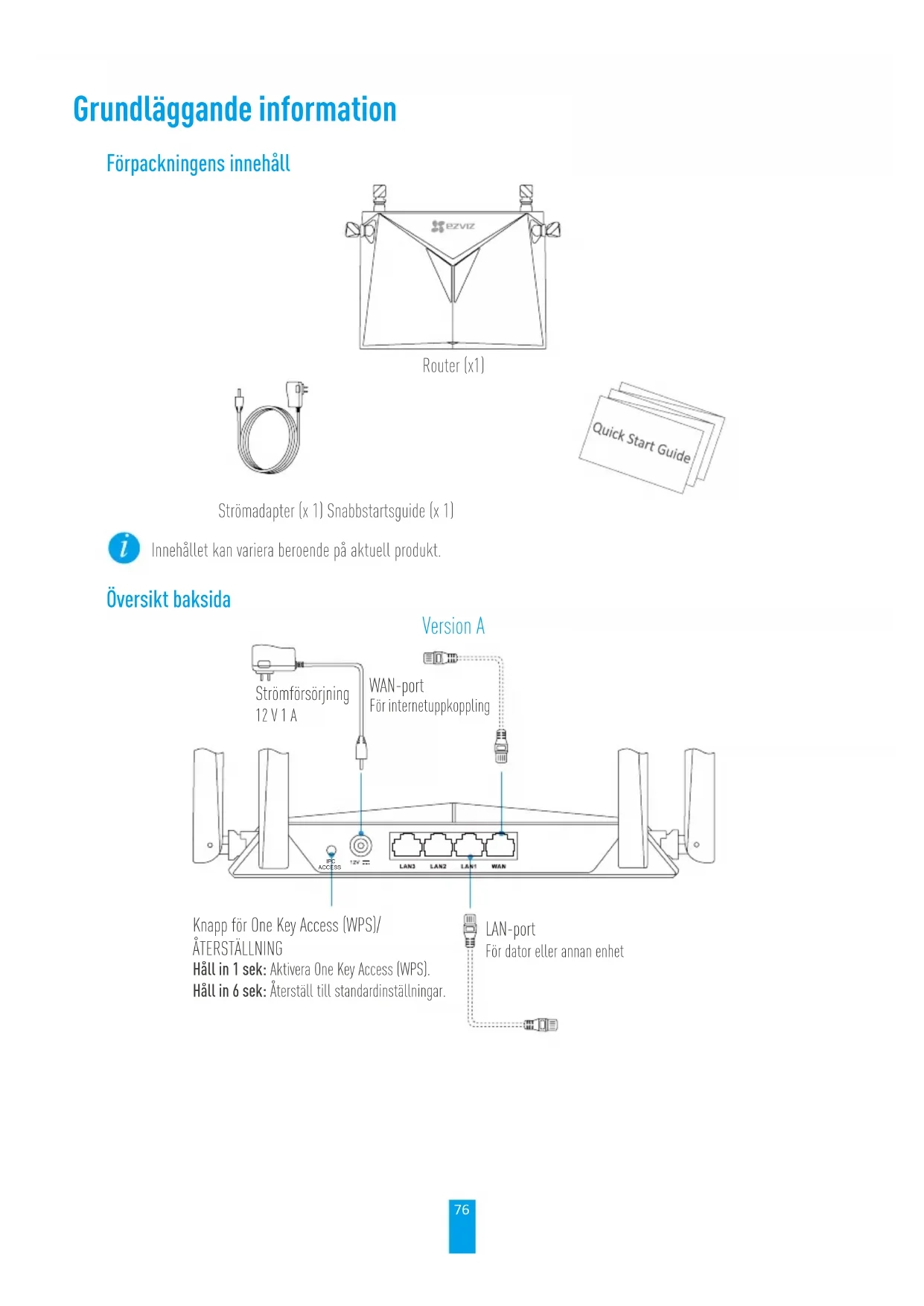 Grundläggande information Förpackningens innehåll Router (x1) Strömadapter (x 1) Snabbstartsguide (x 1) Innehållet kan variera beroende på aktuell produkt. Översikt baksida Version A IPC ACCESS Strömförsörjning 12 V 1 A Knapp för One Key Access (WPS)/ ÅTERSTÄLLNING Håll in 1 sek: Aktivera One Key Access (WPS). Håll in 6 sek: Återställ till standardinställningar. WAN-port För internetuppkoppling LAN-port För dator eller annan enhet77 Version B WAN-port För internetuppkoppling Strömförsörjning 12 V 1,5 A LAN-port För dator eller annan enhet Knapp för One Key Access (WPS)/ÅTERSTÄLLNING Håll in 1 sek: Aktivera One Key Access (WPS) Håll in 6 sek: Återställ till standardinställningar. Ström av/på *USB-port För USB-minne eller extern hårddisk, etc.