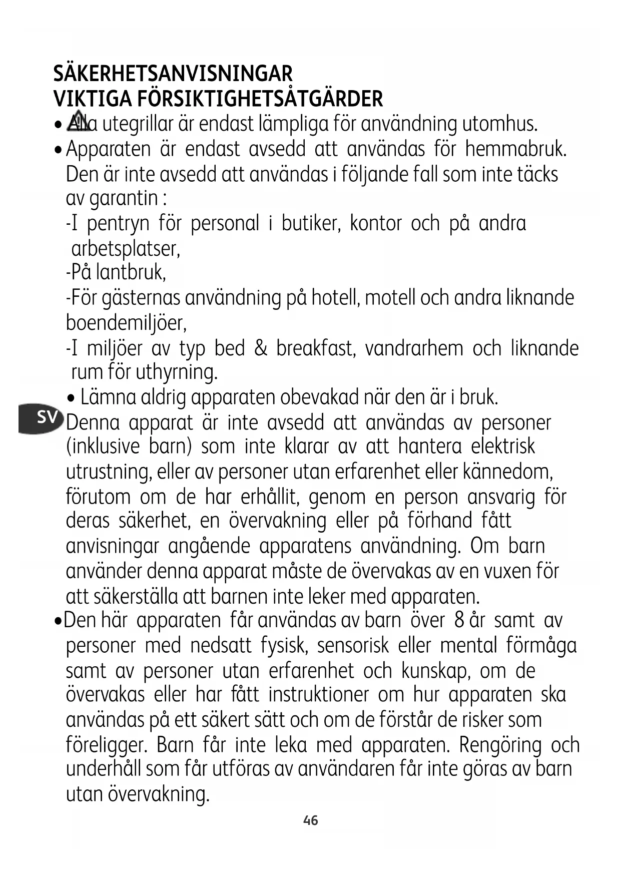 - Den här apparaten får användas av barn över 8 år samt av personer med nedsatt fysisk, sensorisk eller mental förmåga samt av personer utan erfarenhet och kunskap, om de övervakas eller har fått instruktioner om hur apparaten ska användas på ett säkert sätt och om de förstår de risker som föreligger. Barn får inte leka med apparaten. Rengöring och underhåll som får utföras av användaren får inte göras av barn utan övervakning.