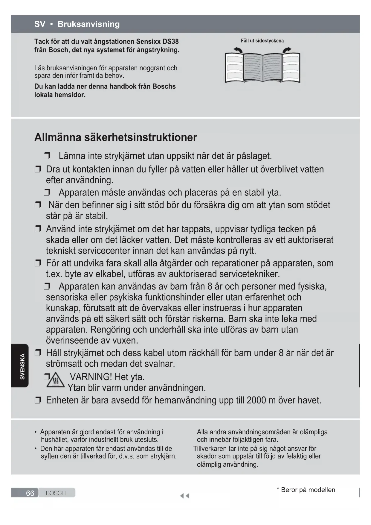 VARNING! Het yta. Ytan blir varm under användningen. ❐ Enheten är bara avsedd för hemanvändning upp till 2000 m över havet. Tack för att du valt ångstationen Sensixx DS38 från Bosch, det nya systemet för ångstrykning. Läs bruksanvisningen för apparaten noggrant och spara den inför framtida behov. Du kan ladda ner denna handbok från Boschs lokala hemsidor. SV • Bruksanvisning Fäll ut sidostyckena